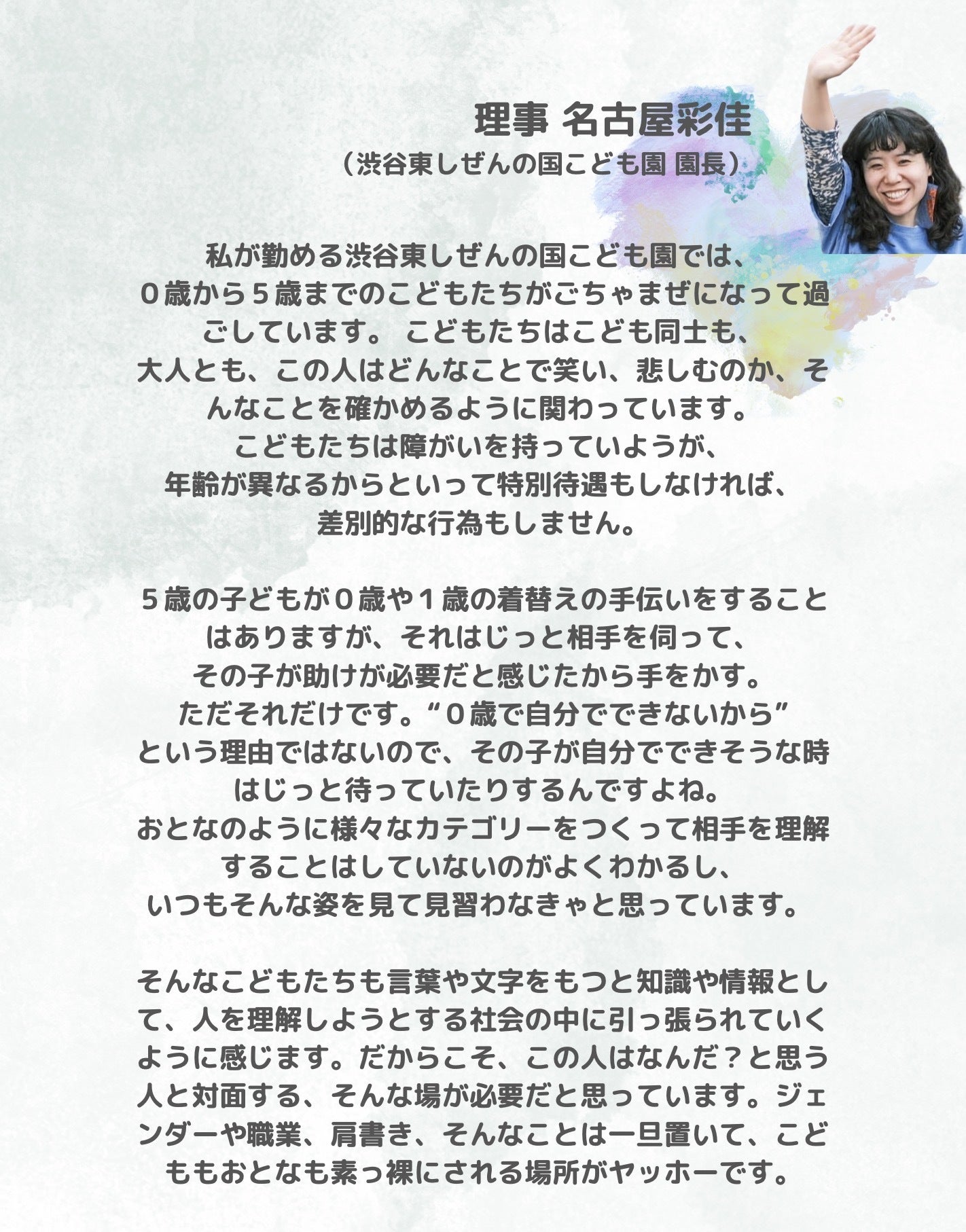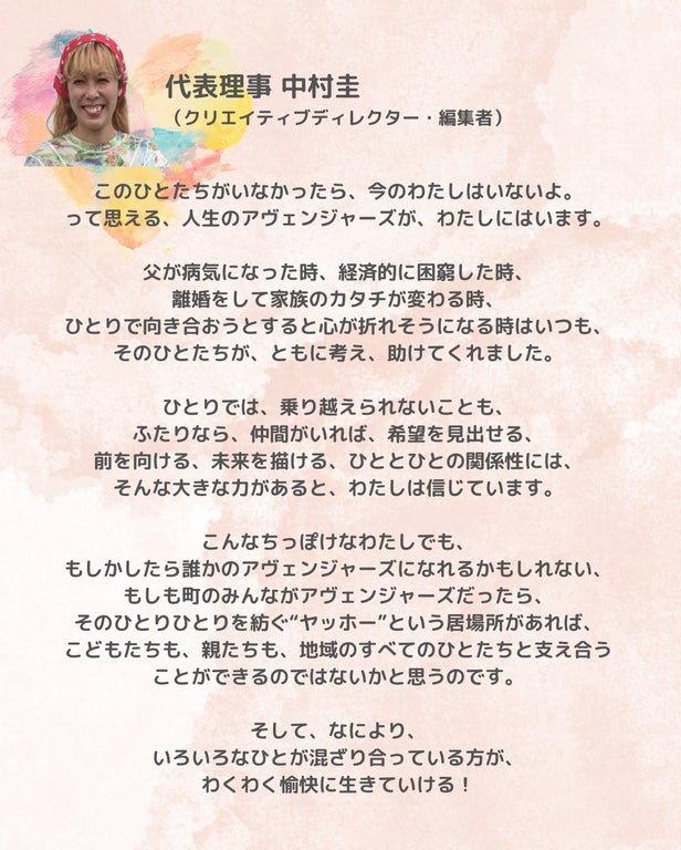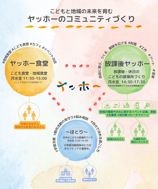 「ヤッホー」は、こどもを真ん中に、町のみんなが支え合い、つながり合い、自然と力を合わせて、ともに未来に希望を見出せるようなコミュニティを育んでいきます。