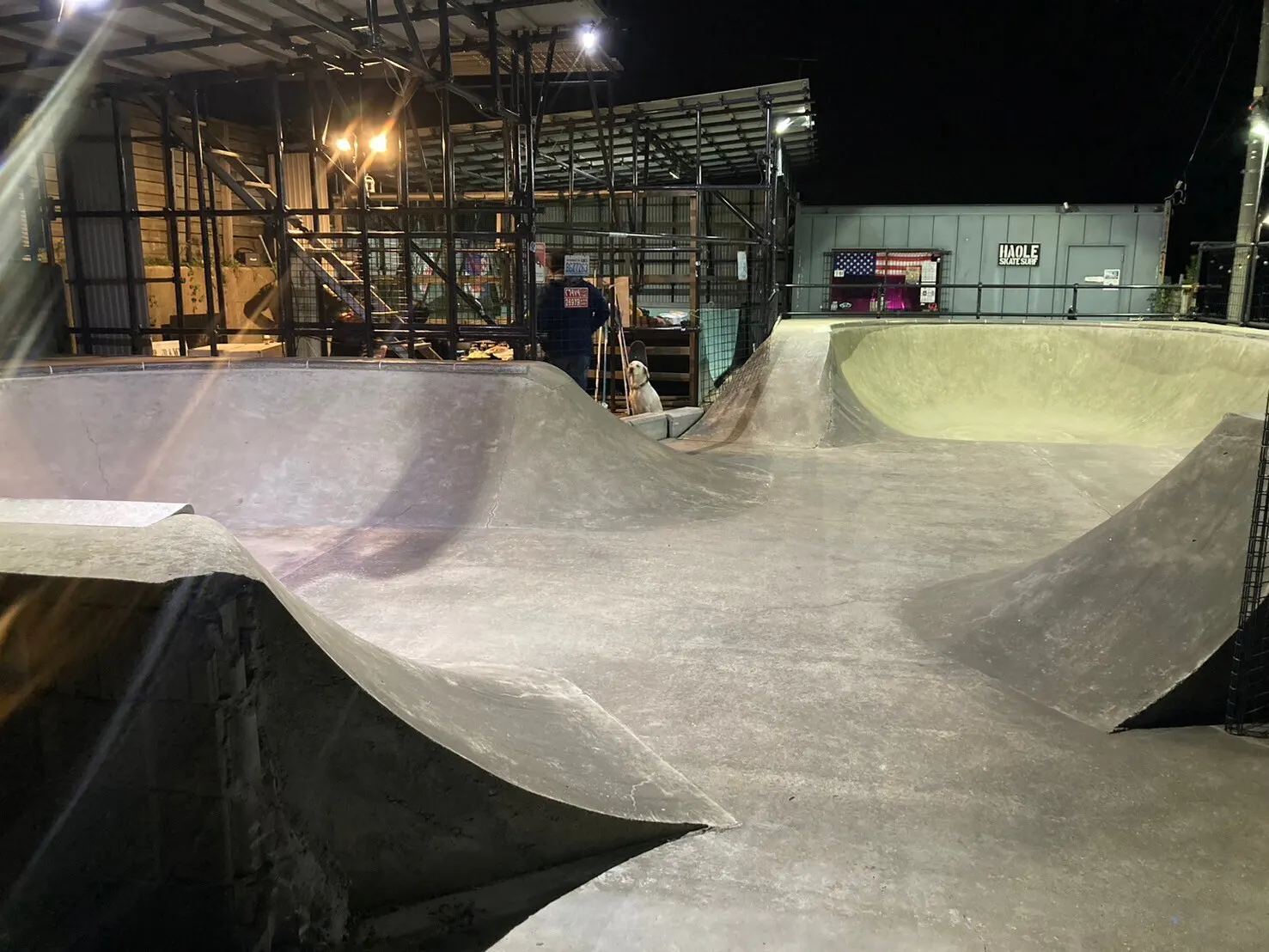 全周をプールコーピングで囲まれたコンクリートの変形ボウルと、初心者にも易しいミニランプ、60坪のフラットエリアがあり、