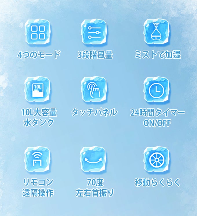 水/氷/保冷剤を使用すると、冷却機能によりひんやりした風を送ることができます。