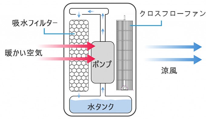 ポンプで水を下部タンクから上部タンクに汲み上げます。その後、水は吸水フィルターを浸して下部タンクに戻ります。クロスフローファンは外気を吸い込んで送風ます。外気が吸水フィルターを通り抜ける際、水は外気の熱を奪って蒸発します。これにより、ファンから出る風が涼しくなります。