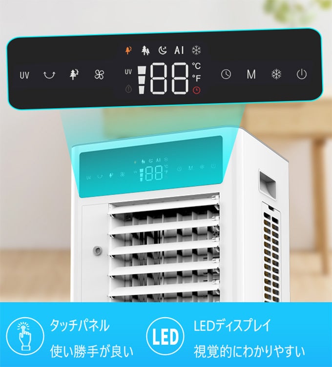 冷風扇の操作パネルは正面に設置しているため、ネコが上に乗っても誤動作は起こりません。さらに、座ったまま操作可能で利便性が向上します。