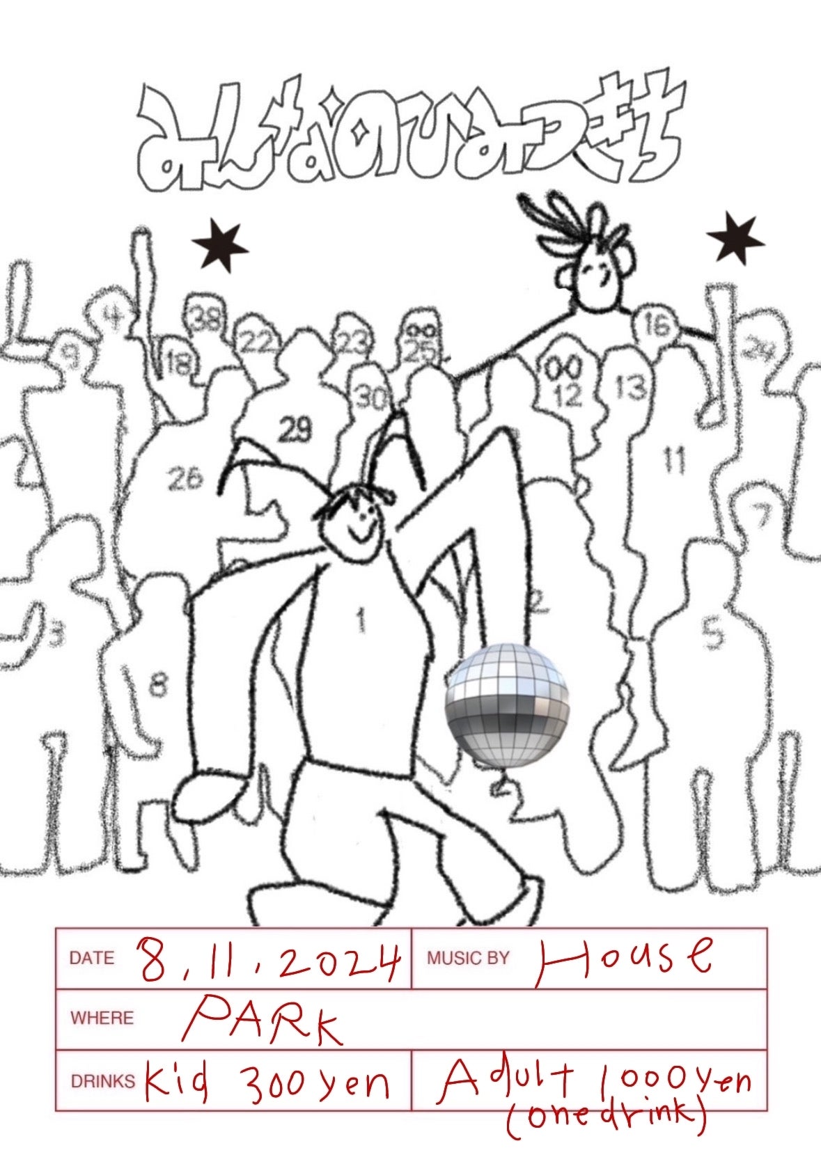 クラブミュージックやクラブはなかなか踏み込みづらい世界なのかと思いきや、そんなことはありません。クラブミュージックは知識の有無に関わらず、聴いたそばから踊りたくなる音楽、さらに同じ空間で体を揺らしながら自己表現ができるクラブには人と人をつなげる力があります。また、クラブでの主役はフロアで踊るお客さんです。クラブミュージックは皆さんそれぞれの踊り方、聴き方、楽しみ方があってオッケーです!私も最初はどう踊れば、楽しめば良いか分かりませんでした。だんだんと見様見真似で体を揺らしてみたり、隣の人に「この音楽めっちゃやばいですね..」と話しかけてみたりして、自分なりの楽しみ方を見つけていけば良いと思います。DJブースの前におもちゃを並べてもいいし、かっこいい音楽を聴きながら計算ドリルを解いたってオッケー!終わりそうにない夏休みの宿題を持ってきたってオッケー!!クラブやそのフロアはフリーな空間であるべきだと思います。そしてこどもたちに限らず、来てくださった皆様に素敵なご縁や繋がりが生まれたら本当に嬉しい限りです。