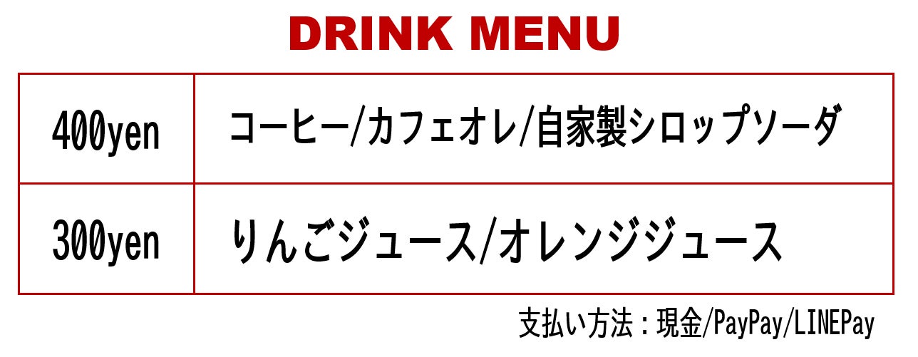 飲食について:当日はSHIBA COFFEEさんにも営業していただいております。以下のドリンクメニューと焼き菓子を用意してくださいます。テイクアウトのみです。 ぜひご利用ください。