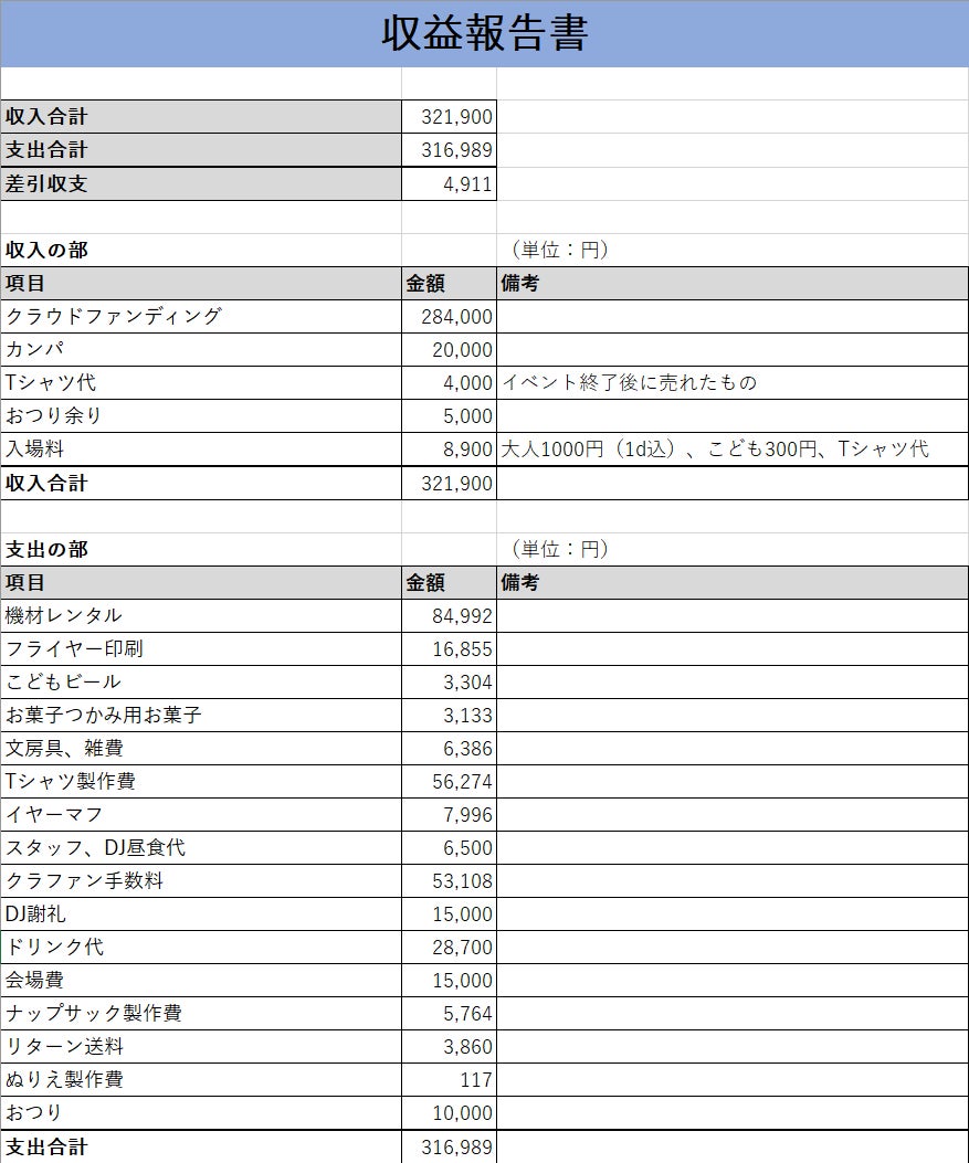 2024/10/02 17:12ご無沙汰しています。プロジェクトオーナーの薮下です!イベント実施から1.5か月ほどが経ち、だんだん涼しく感じる日が増えましたね...。そういえば、イベントで売れ残ったオリジナルTシャツを 欲しい!と言ってくださった方がいて、ようやくその方にお渡しすることができました!それをもって収支が確定したので、大変遅くなりましたが、皆様からいただいたご支援の収支報告をさせていただきたいと思います。改めまして、この度はお力添えをいただき、誠にありがとうございました!また、このイベントを通じて新たなつながりができ、10月20日(日)に福井県鯖江市の西山公園で初開催される「さばえまつり」にて、DJ企画を持たせていただけることになりました。西山公園の広場にやぐらを組み、その上でDJが音楽をかけるという斬新な企画です。13時から15時の間に、福井県で活躍されているDJの方に音楽をかけていただきますので、お時間ある方はぜひお越しください!他にもエレクトロニコス・ファンタスティコス(Instagram:@electronicosfantasticos)や馬喰町バンド(Instagram:@bakurochoband)など様々なアーティストのパフォーマンスや廃材アートのワークショップなど70近くの企画が盛りだくさんですので、皆様遊びにいらしてください!第二歩目はこちらのイベントということで、これからもまだまだ頑張っていきたいと思います!引き続き見守っていただけますと幸いです!! もっと見る