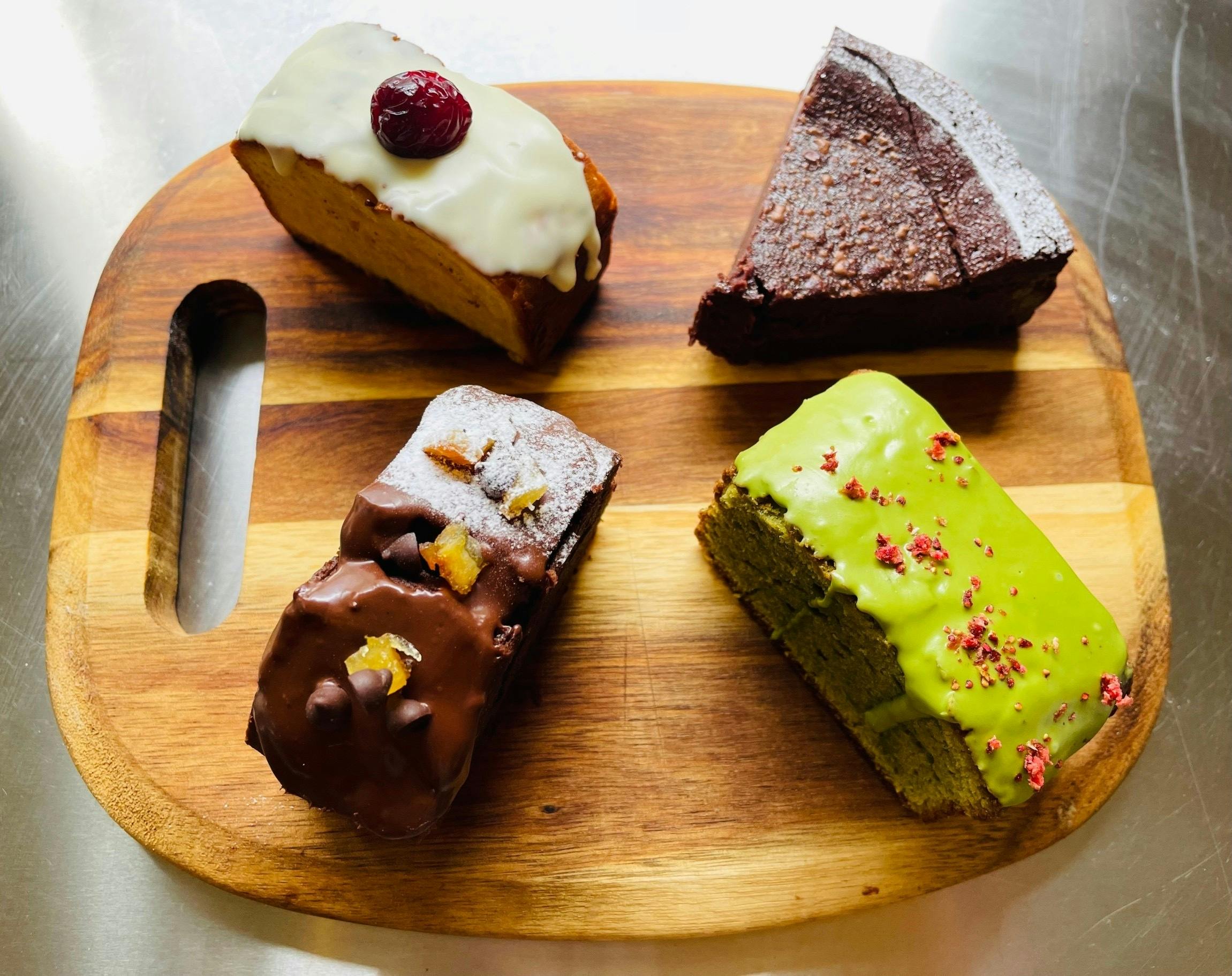 【抹茶ガトーショコラ】原材料 : 米粉・アーモンドパウダー・きび糖・無塩バター・生クリーム・ホワイトチョコレート・抹茶パウダー・モリンガパウダー・ドライストロベリー