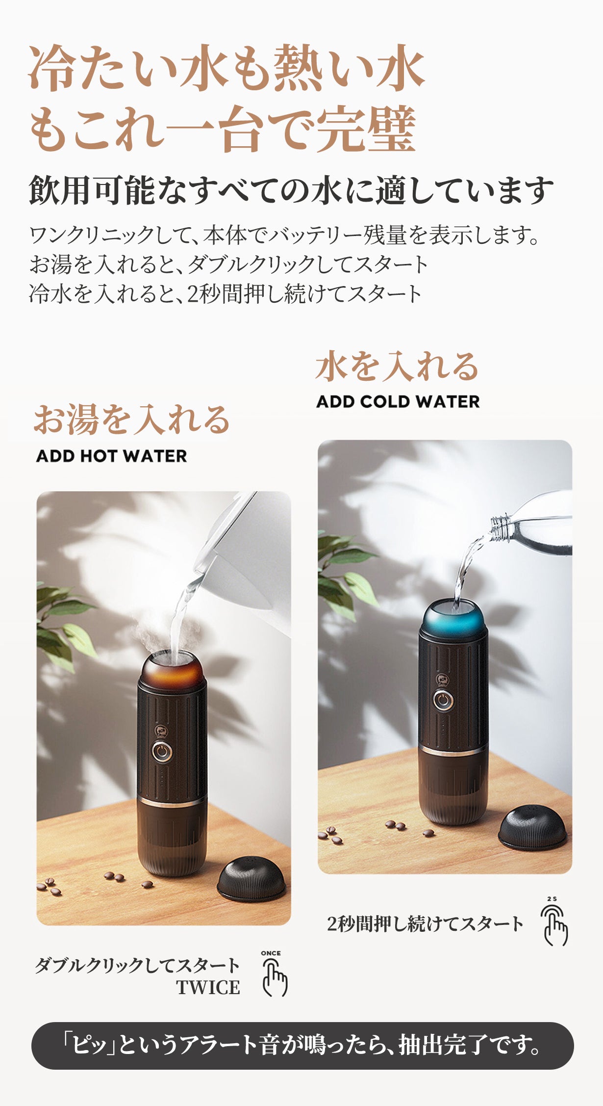 今こそ、携帯型エスプレッソマシンで、どこにいても極上のコーヒーをお楽しみください。毎日の生活に豊かな味わいとスタイルを加えるための完璧な選択です。ご自身へのご褒美に、または大切な人へのプレゼントにも最適です。