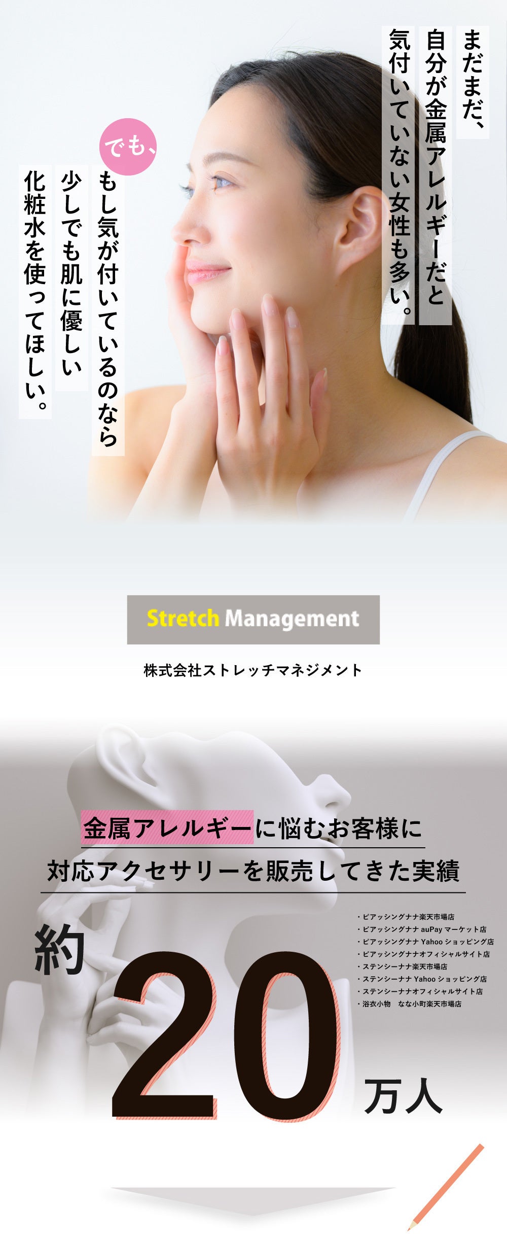 私たちは約20万人の金属アレルギーの人に悩むお客様の「お洒落を楽しむことができない」というお悩みを解決してきました。