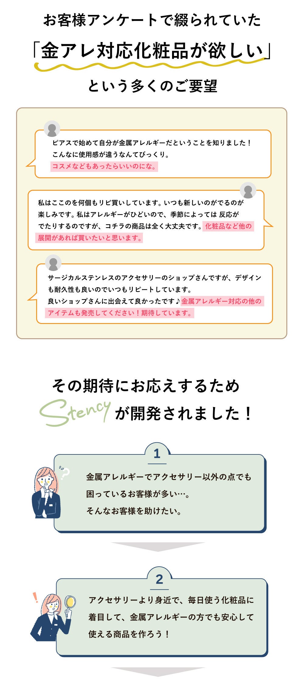 金属アレルギーの方だけでなく、あらゆる肌タイプの方が安心してお使いいただける商品をお届けすることが私たちの目標です。
