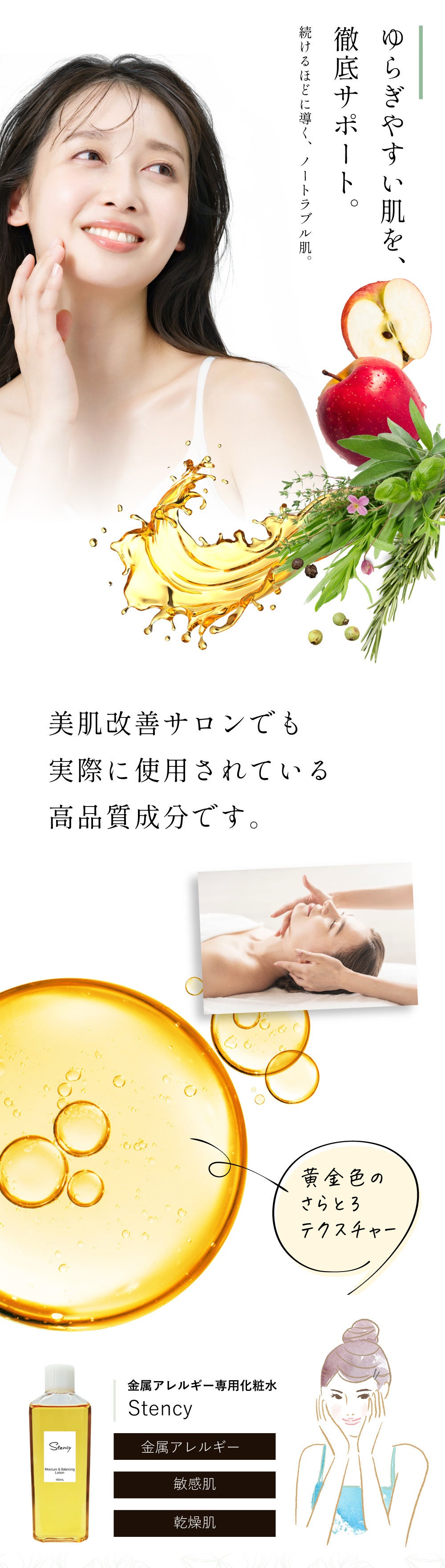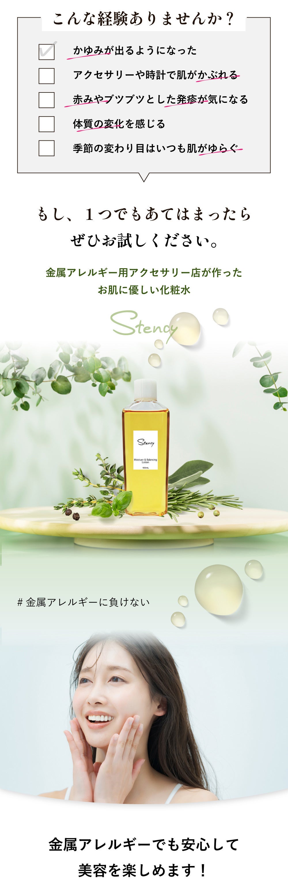 金属アレルギー症状が出てしまう敏感肌の方、お肌が繊細な方、お肌が刺激に弱い方にも