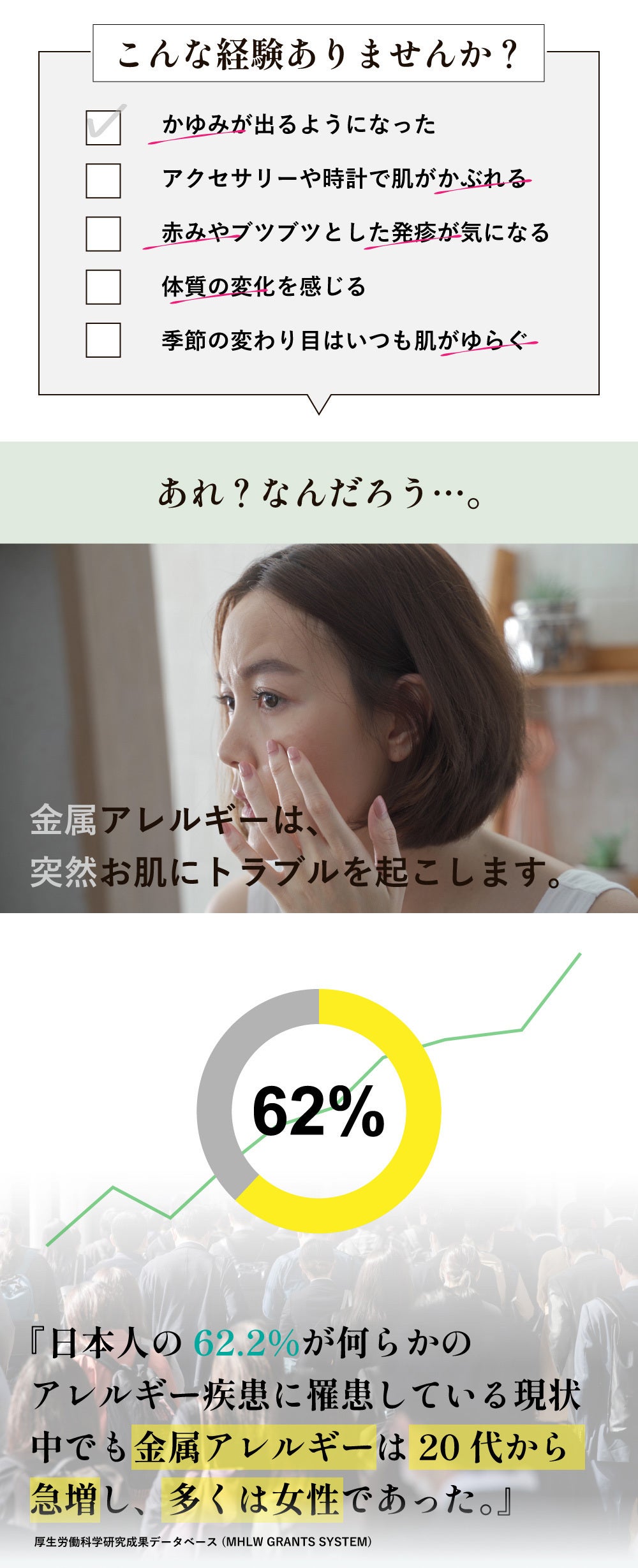 私たちは約20万人の金属アレルギーの人に悩むお客様の「お洒落を楽しむことができない」というお悩みを解決してきました。