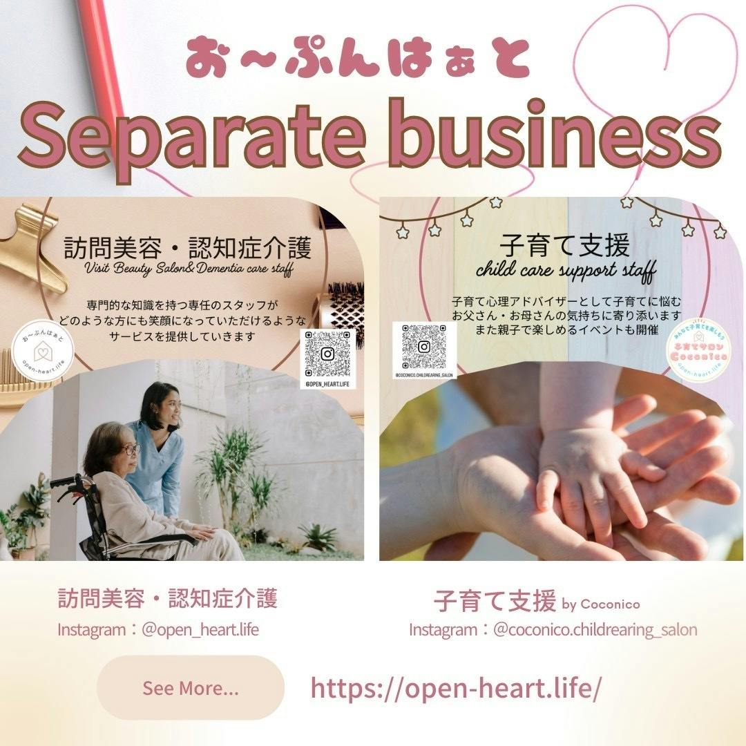 ◎私たちの他事業(訪問美容・認知症介護・子育て支援)で、様々な年代の皆様が、毎日笑って過ごすためのサービスの提供を拡大していきたい