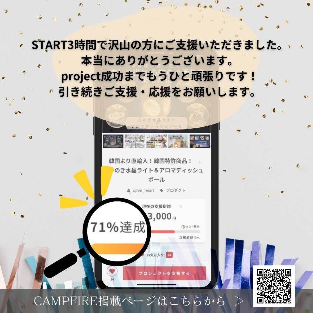ひのき水晶ライト&アロマディッシュボールに沢山の方からご支援を頂きまして、本当にありがとうございます!素敵な商品をみなさまにお届けできる日がとても楽しみです。このプロジェクトを盛り上げて頂きました事、心より感謝しております。しかし目標はさらに先にございます。引き続きより多くの方に、この商品をお届けできるよう、みなさまご支援・応援のほど、よろしくお願いいたします。Instagram・Facebook・TikTokでは最新情報をこれからも随時更新していきます。ぜひご覧ください。シェアもぜひよろしくお願いします!