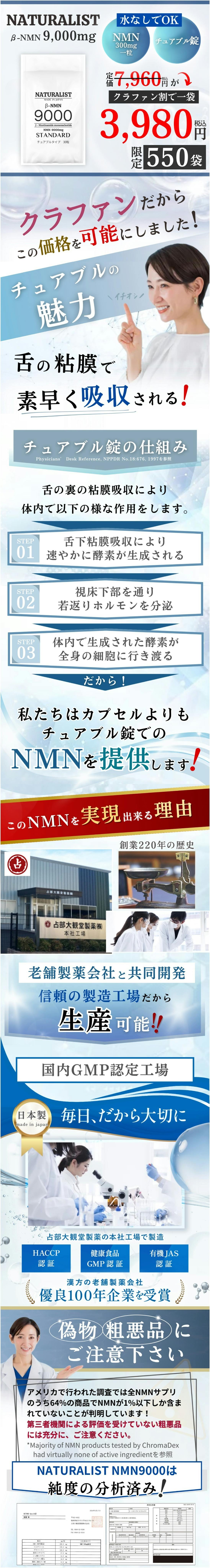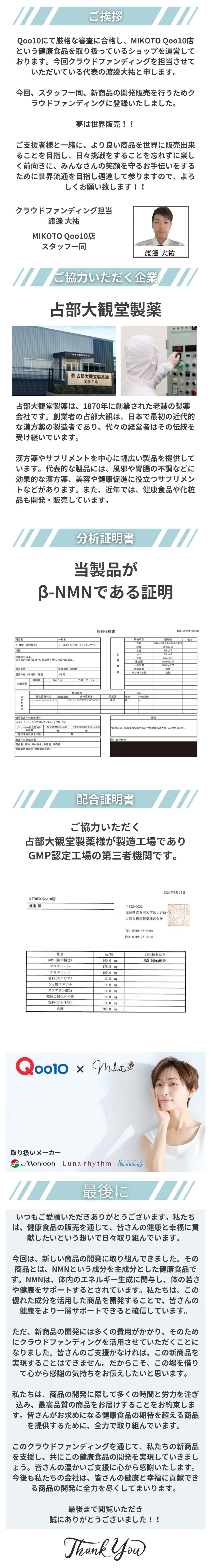 2024/06/05 21:00私たちは、健康と長寿を追求するために、NMN(ニコチンアミドモノヌクレオチド)の効果を最大限に引き出す方法を模索してきました。NMNは、細胞のエネルギー生産に重要な役割を果たすことが知られており、老化のスローダウンや疾病の予防にも効果があると考えられています。しかし、現在市場に出回っているNMNサプリメントは、主にカプセル形式で提供されています。カプセルは便利ではありますが、消化器官を通過する過程で一部の有効成分が失われることがあり、吸収率が低下する可能性があります。そこで、私たちはより効率的な吸収を実現するために、舌下吸収に特化したNMNチュアブル錠を開発することにしました。舌下吸収とは、舌の下に錠剤を置くことで、粘膜から有効成分が直接吸収される方法です。この方法は、消化器官を通過する必要がないため、効果的な吸収が期待できます。さらに、舌下吸収は速やかに体内に取り込まれるため、効果がより早く現れる可能性があります。NMNチュアブル錠の開発には多くの研究と試行錯誤が必要でしたが、私たちはその努力に自信を持っています。しかし、開発には膨大な費用と時間がかかるため、このプロジェクトを実現するためには資金の支援が必要です。そこで、私たちはクラウドファンディングを始めることにしました。私たちの目標は、より効果的なNMNサプリメントを開発し、多くの人々が健康で充実した人生を送れるようにすることです。クラウドファンディングに参加していただく皆様のご支援をいただければ、私たちは一層の研究と開発に取り組むことができます。私たちのプロジェクトには、健康志向の方々や長寿を追求する方々からの支援が必要です。NMNチュアブル錠の開発によって、より効果的なNMNサプリメントが手軽に利用できるようになり、多くの人々の健康への取り組みが加速されることを期待しています。ぜひ、私たちのクラウドファンディングにご参加いただき、健康と長寿を追求する旅に一緒に参加しましょう。皆さまのご支援に心から感謝申し上げます。MIKOTO Qoo10店 スタッフ一同 もっと見る