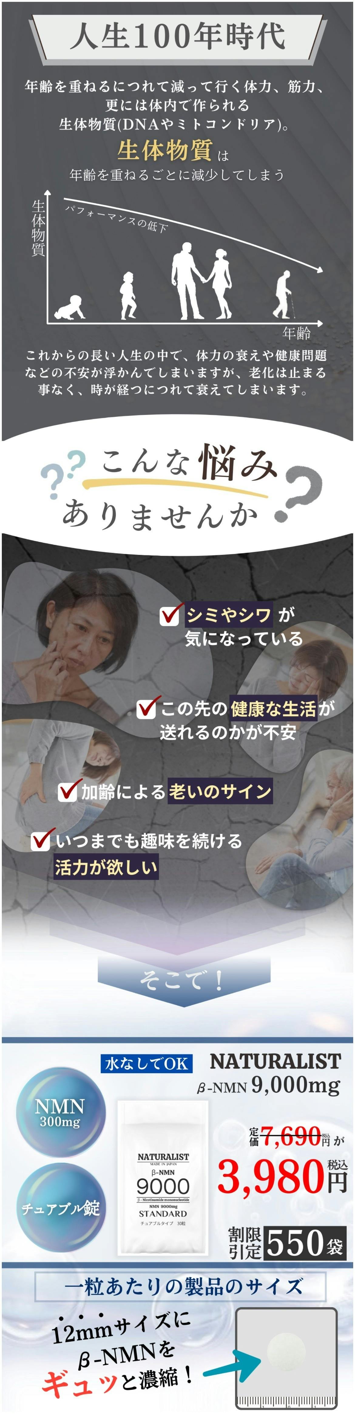 「人生100年時代、老化が進む現代社会で、私たちは何もしなければ足腰が弱り、免疫力も低下する運命に直面しています。しかし、そんな不安に満ちた未来にNMNが登場しました。NMNは、年齢とともに衰える私たちの身体をサポートし、健康で元気な生活を取り戻すための革新的なサプリメントです。老化への抑制力を高め、足腰の強化や免疫力の向上に役立つとされています。NMNを摂取することで、私たちは人生100年時代を充実したものに変えることができるのです。」