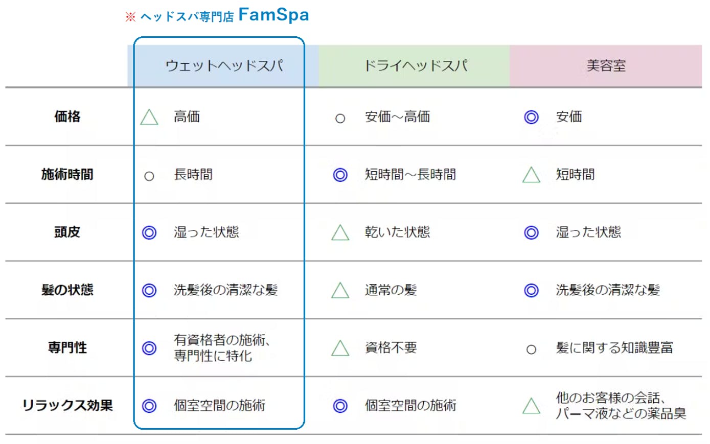 メディアやSNSなどでヘッドスパが広まりつつあるのに対して、多くの方が美容院のオプションメニューという認識があるようです。 またわたしたちのようなヘッドスパ専門店以外にも様々な提供方法があり、それぞれ以下の特徴があります。