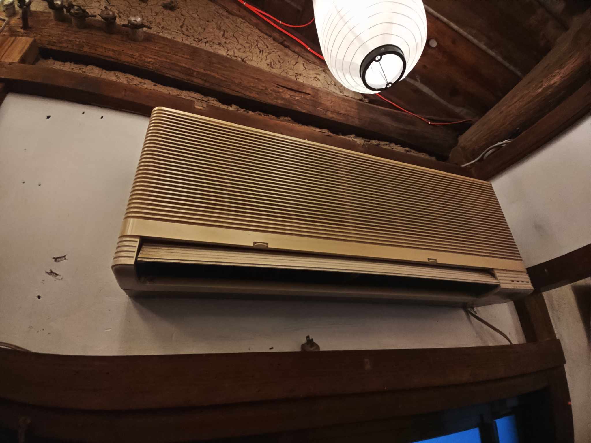 元からついていたエアコンは明らかに昭和の時代の古い型で直すことも困難だということがわかりました。このままでは繁忙期である夏に営業することができません。同時に電圧も足りず営業中に数回ブレーカーが落ちてしまう始末。エアコン交換と共に電圧も上げる工事も必要なことが判明しました。