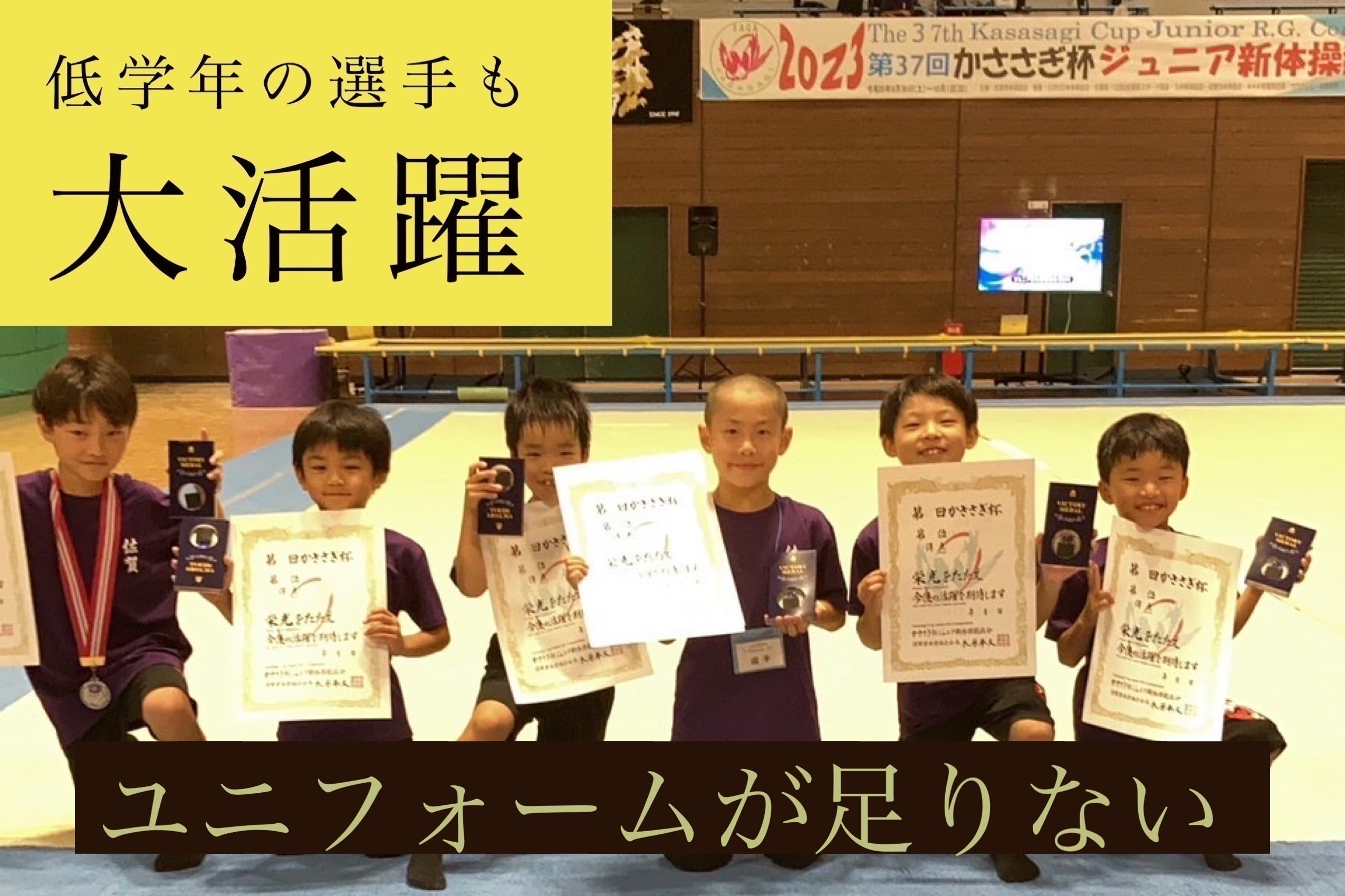 そこでSNSで訴えかけたところ、クラウドファンディングに挑戦することに致しました。ユニフォームを1団体分作ることは、これまでに作ったユニフォームを控えの選手が着ることができるようになります。というのも、神埼ジュニア新体操クラブでは、2月に開催されたサニックスカップ男子新体操競演会に団体7チーム、個人22名出場しています。(男子新体操を知っている人からすると信じられない数字)高学年のチームはこれまでに作ったユニフォームを着ることができますが、低学年チームは、Tシャツで試合に出ています。(ローカルルールのため減点はありせん)