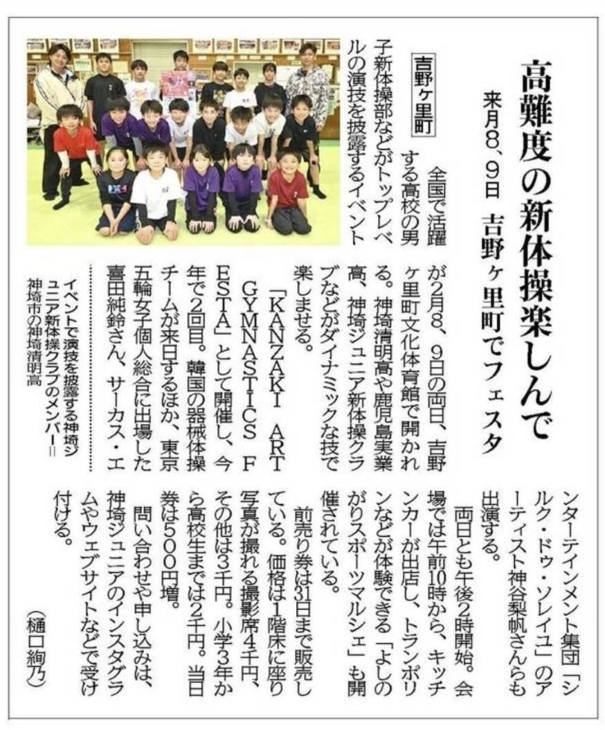 【KANZAKI ART GYMNASTIC FESTA 2025】の記事が佐賀新聞に掲載されました!!さらに多くの人に知ってもらえるように頑張ります!!そしてラスト1週間!実行委員会一同皆様のご来場をお待ちしております。天気が心配・・・