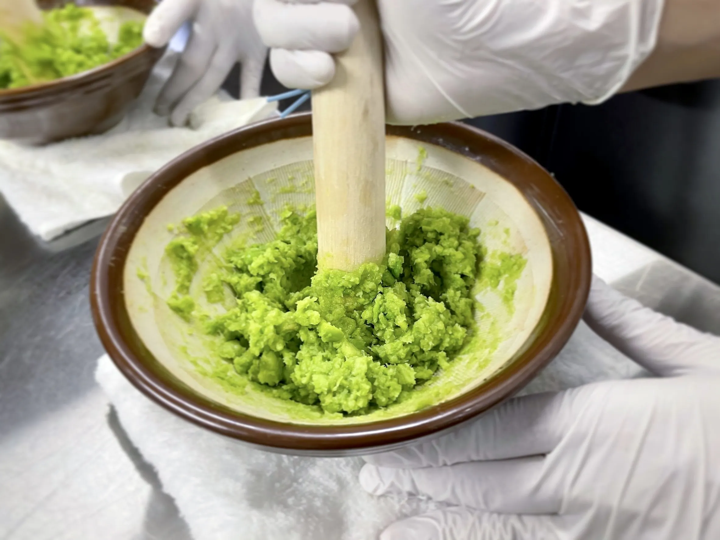 ずんだあんは、仕入れた枝豆を1粒1粒薄皮を向いて、手作業で「すり鉢」で潰して作り上げる。