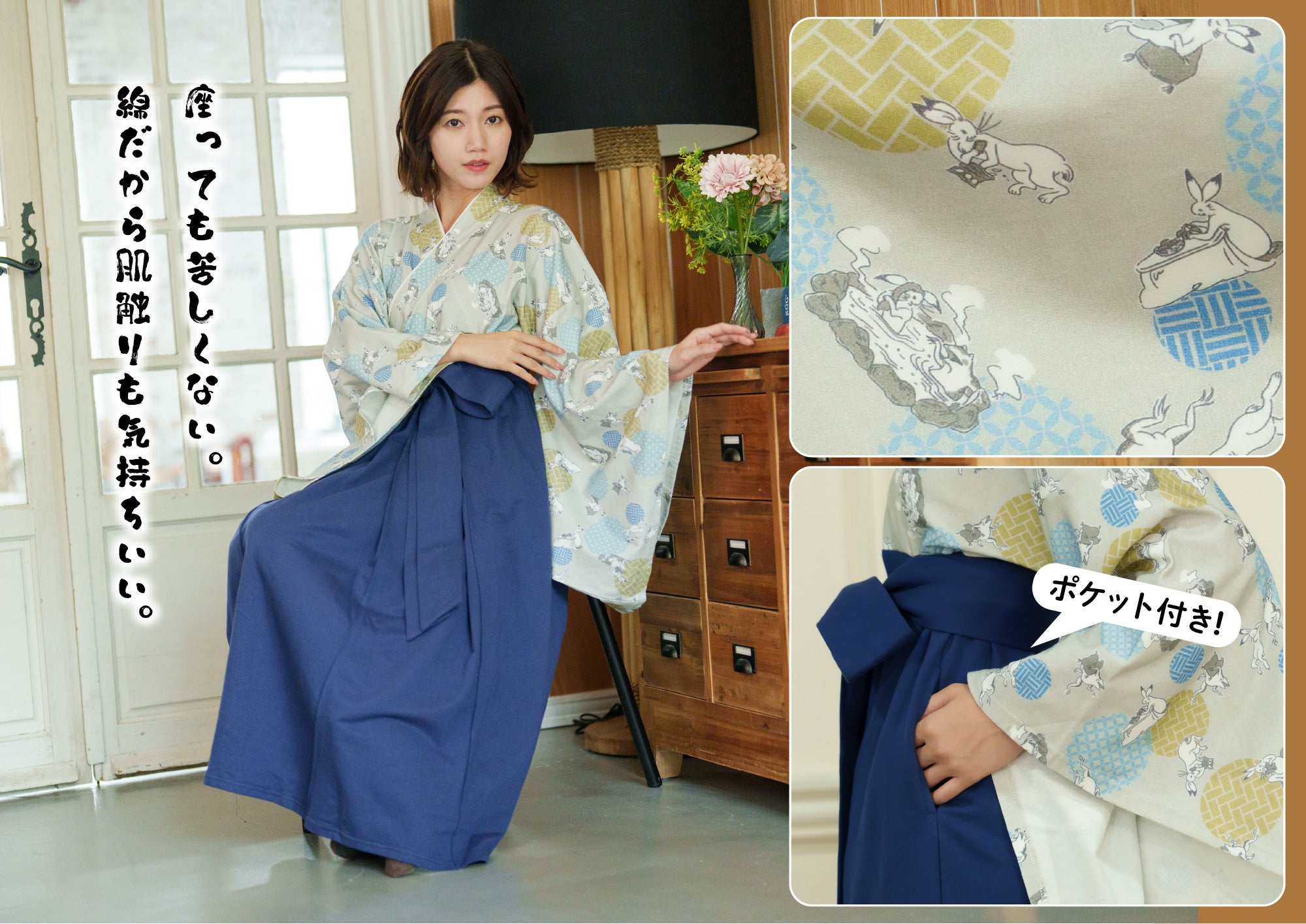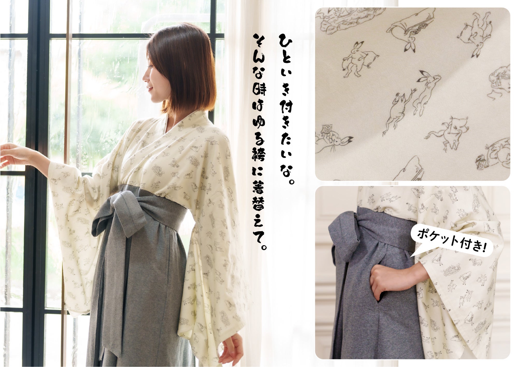 ウサギやカエルが様々なリラックスタイムを楽しんでいる様子が描かれています。思わずクスッと気が緩むような「ゆる袴」で和の温もりを感じながら、心地よい時間を楽しんでみませんか?