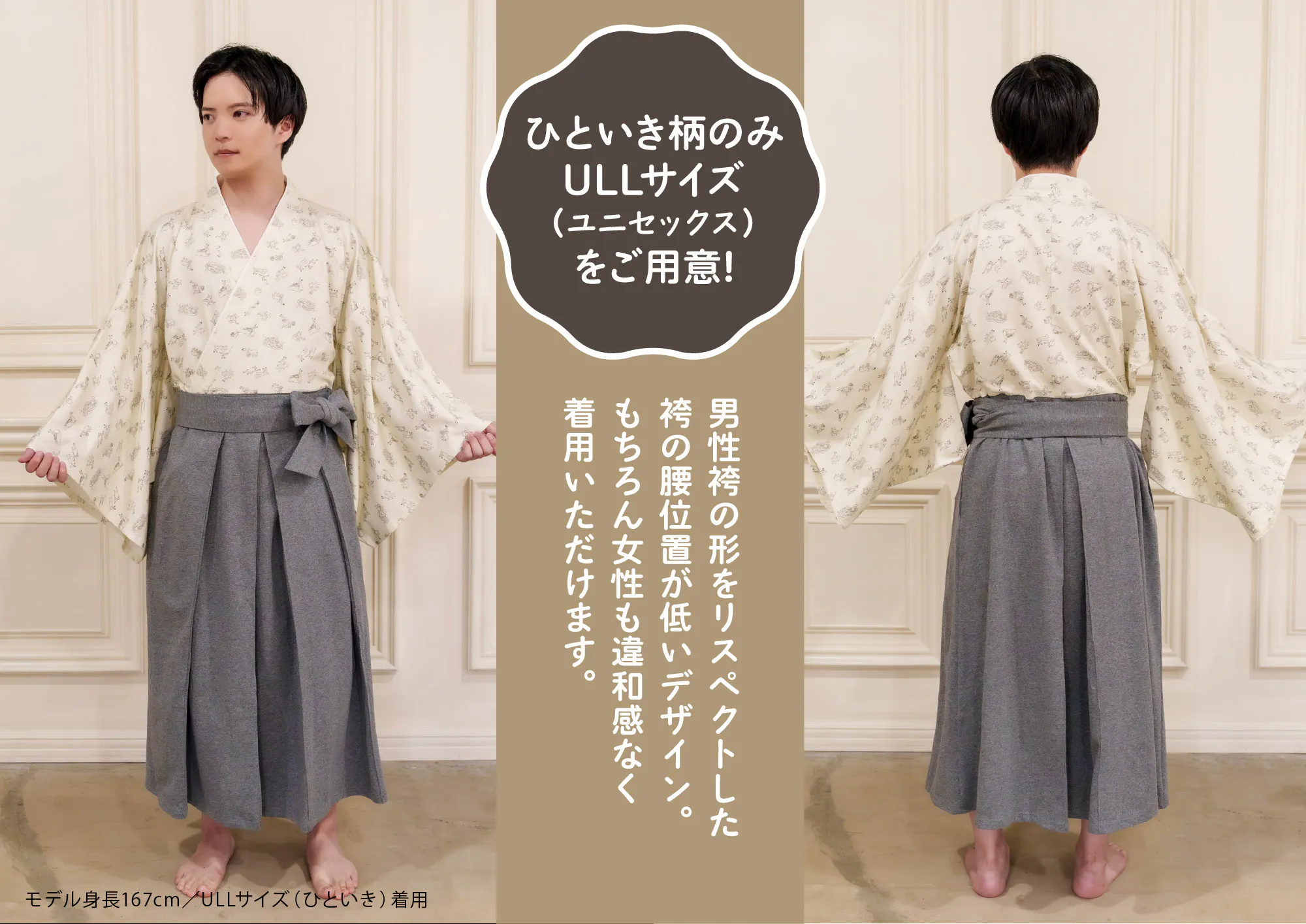 灰色の袴が印象的な「ひといき」は、男女問わず使いやすい落ち着いたデザインです。