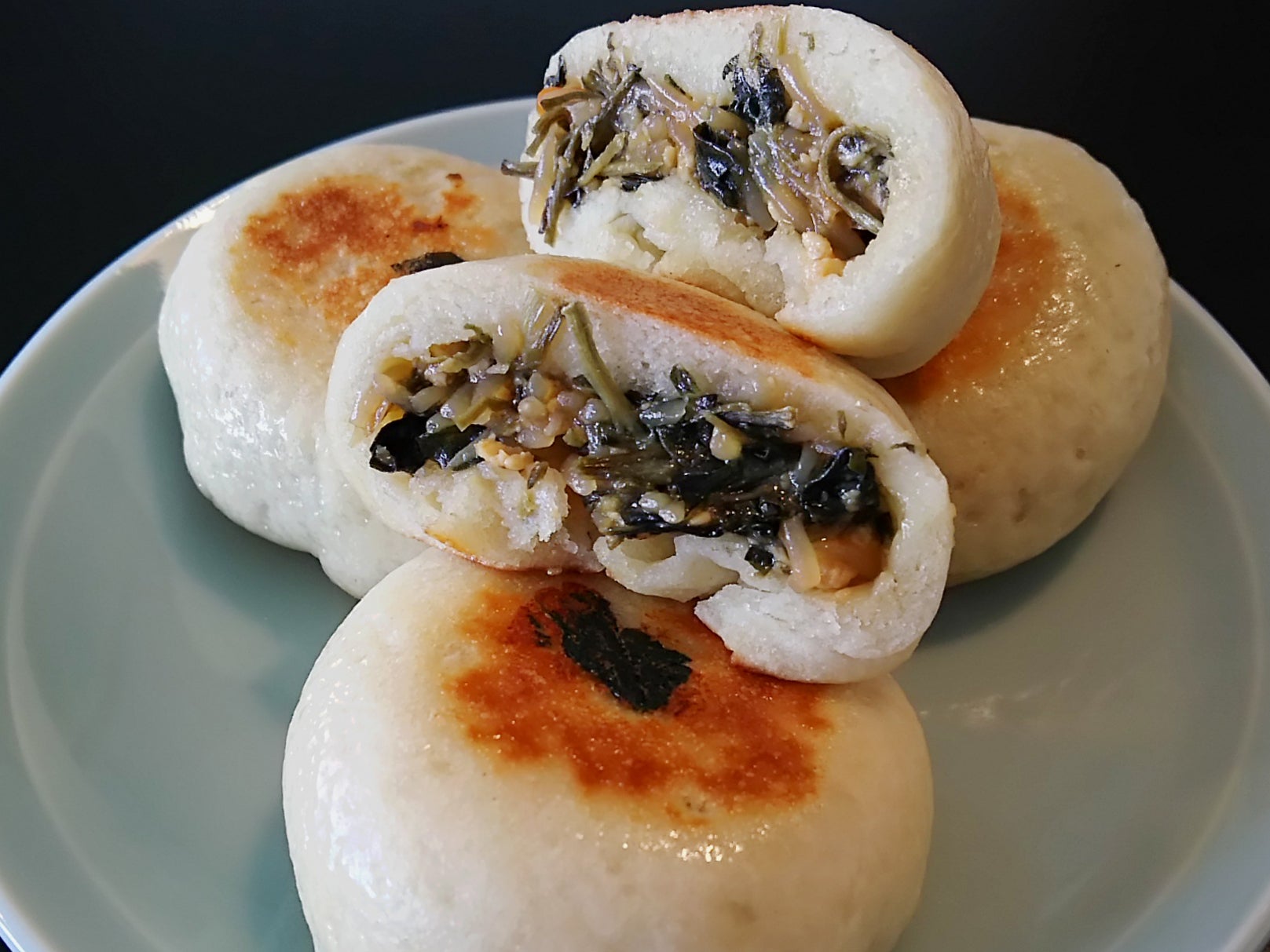 表面にパリパリの焦げめ、中には山形青菜、遠山蕪の味が活きている具がたっぷりのお焼き、3種類の純米酒、とても美味しかった♡です。