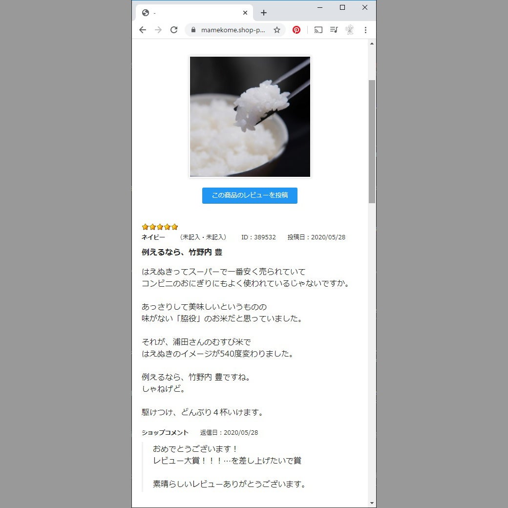 ですが、浦田農園さんの「むすび米・はえぬき」はちょっと違うんですね。その感想を、浦田農園さんのホームページでこんな風にレビューしている方がいました。
