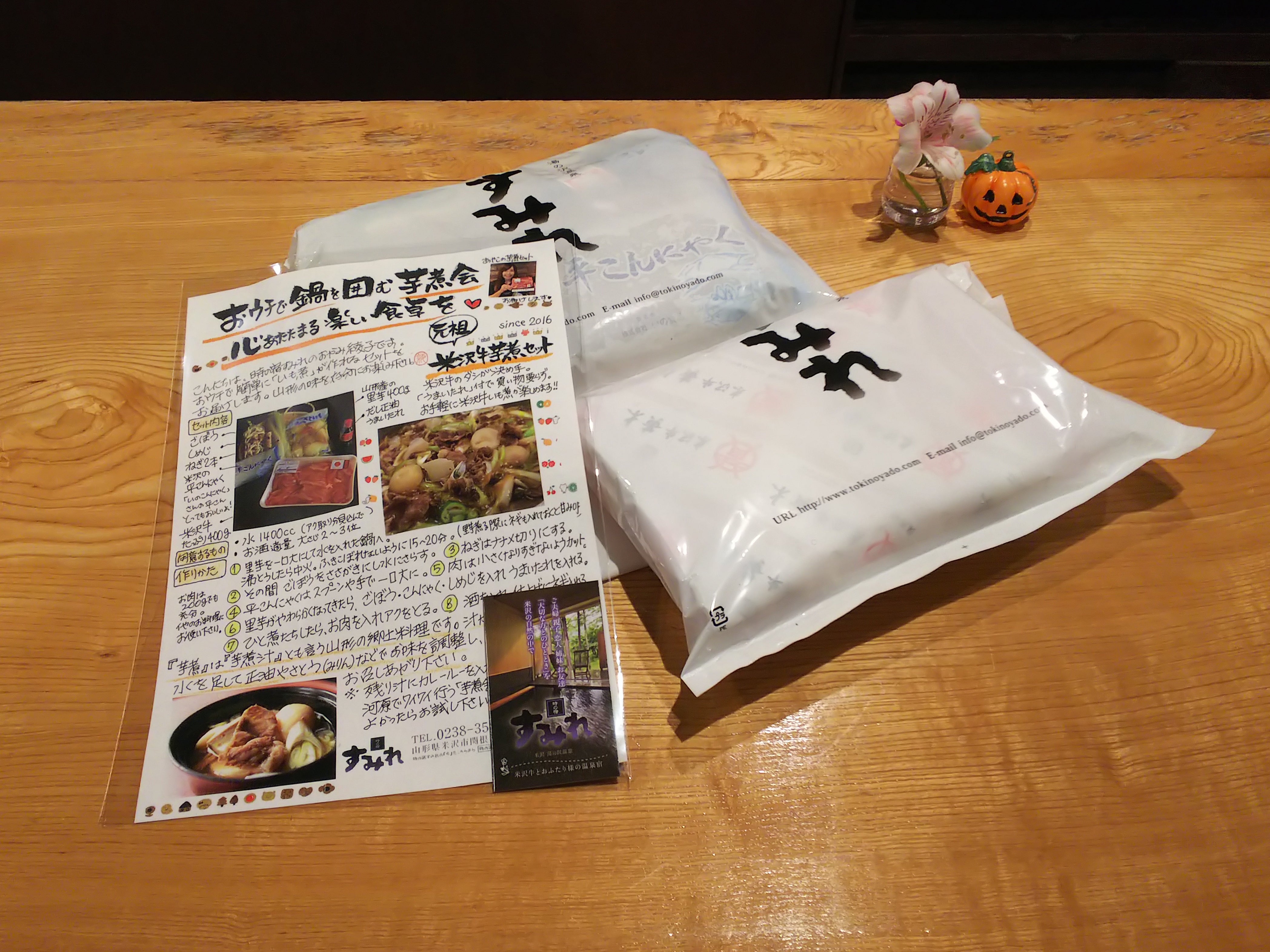 冒頭の写真は、「時の宿すみれ」 のラウンジで発送直前の芋煮セットを撮ったものです。