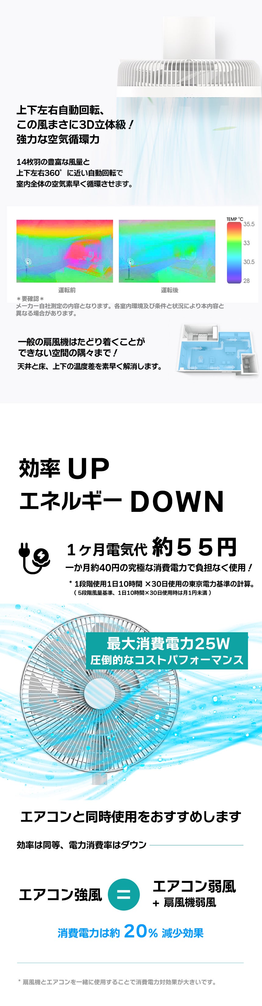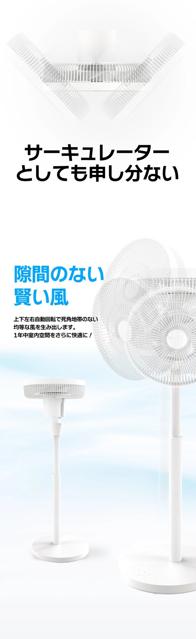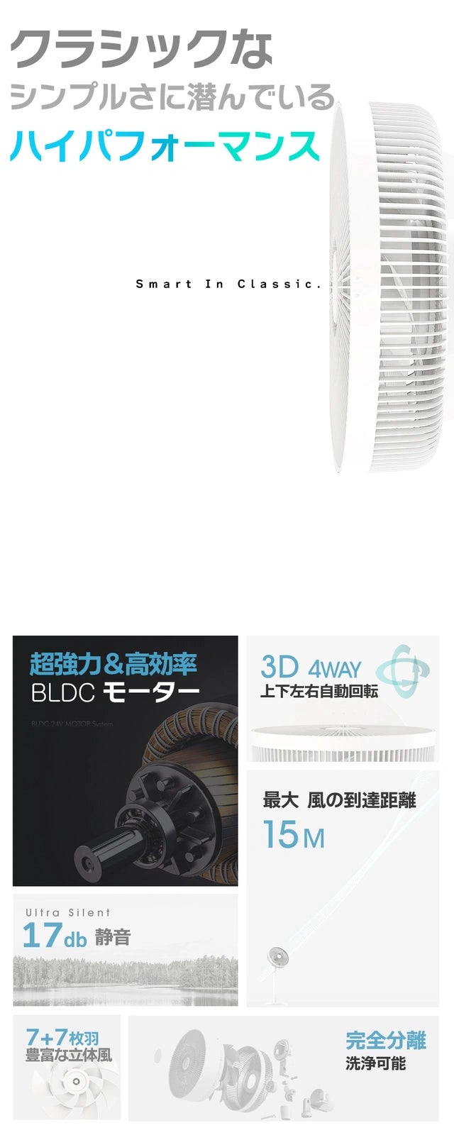 より自然な風からさらに強力な風までサポーター様のあらゆる使用状況に応じご満足いただけるように高品質のBLDCモーターを採用、効率はアップ・発熱はダウンすることができました。