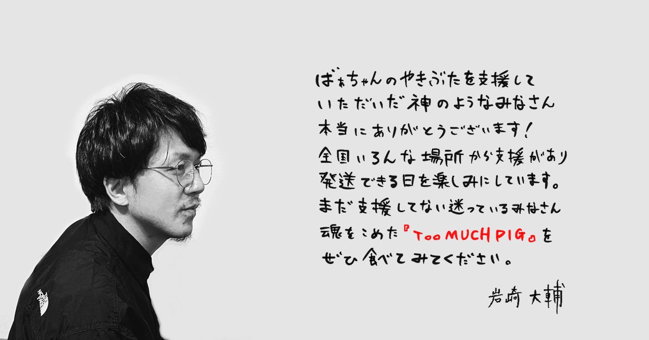 「ばぁちゃんの愛したやきぶた, TOO MUCH PIG」を多くの方々にお届けするためのこのプロジェクトが、皆様の温かいご支援によってここまでの成功を収められたことに、心から感謝しています。