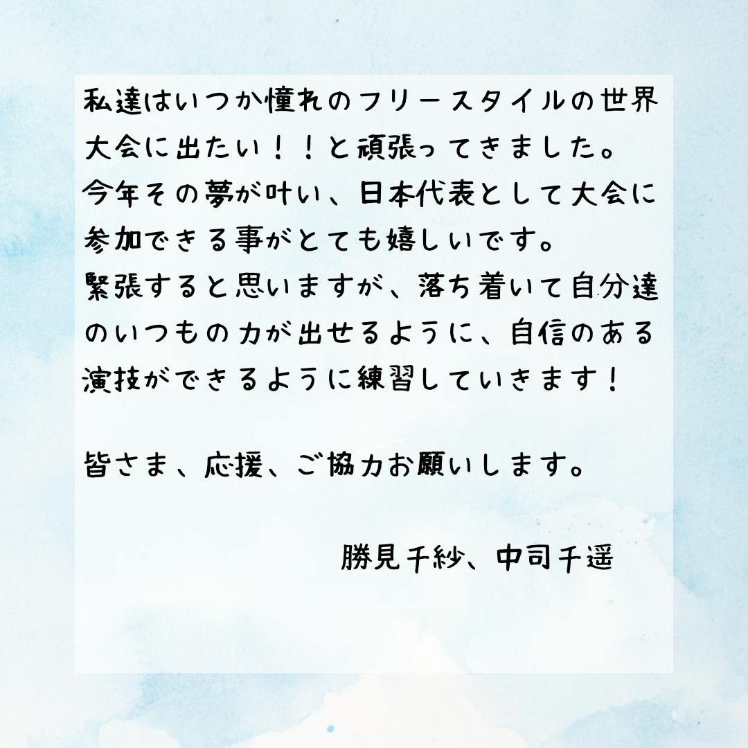 このような形で皆様にお願いすることは初めての経験ですが、世界の舞台で良い演技をして目標達成できるよう頑張りたいと思っています。