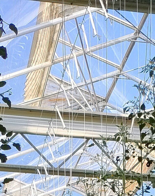 誘引サポートフックは、ハウスの天井に張られたワイヤーに引っ掛けて使用します。