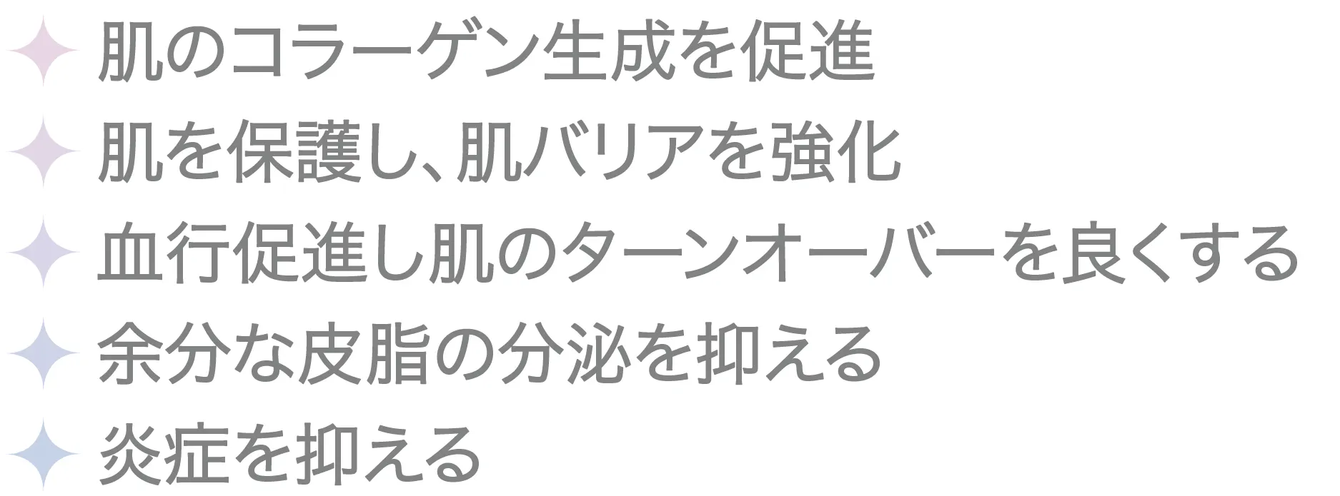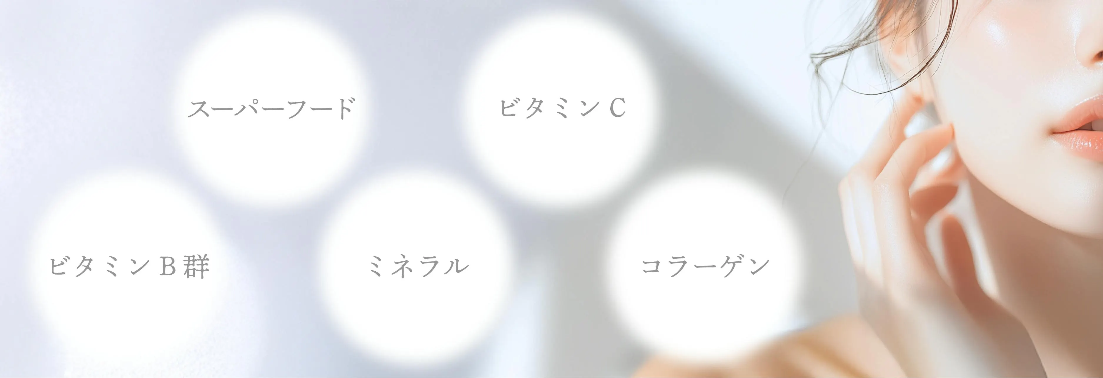 スーパーフード、ビタミンC、ビタミンB群、ミネラル、コラーゲンなど、美肌に効果的な成分を贅沢に配合。