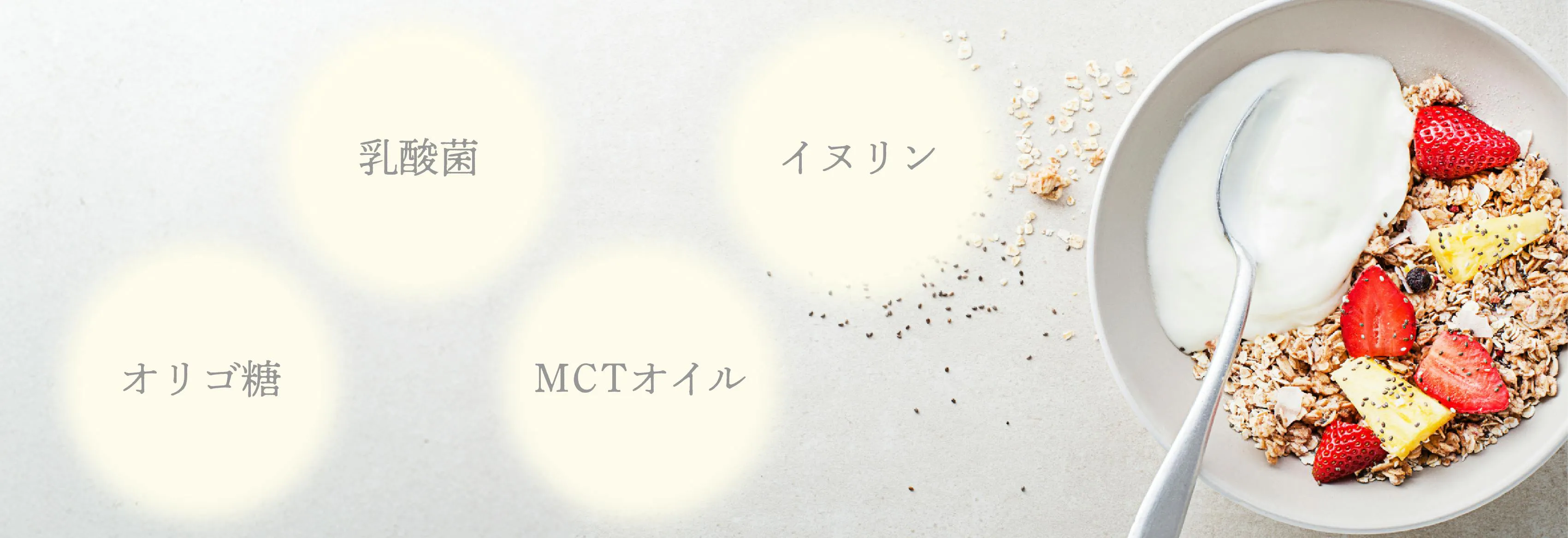 腸内の活性化成分として、乳酸菌やアガベ、高品質のイヌリン、オリゴ糖、MCTオイルも配合しています。
