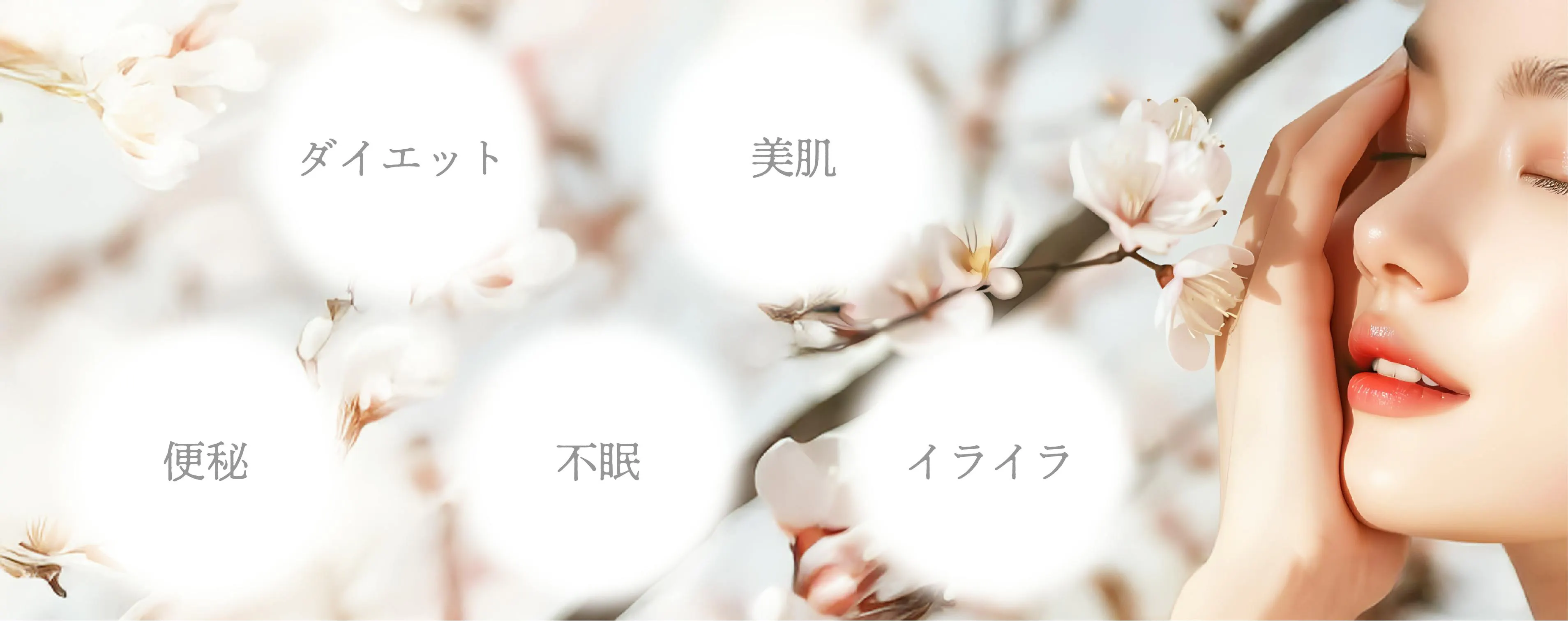 ダイエット、美肌、便秘、不眠、イライラなど、現代女性が抱える様々な悩みにアプローチ。