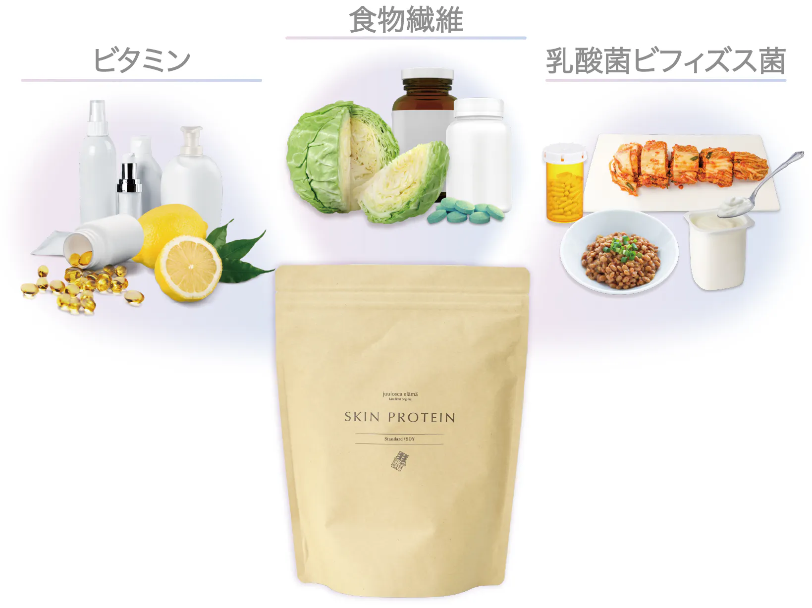 スキンプロテインはタンパク質が摂れるだけではなく、肌を改善するために必要な成分が一緒に全部摂れちゃうんです!