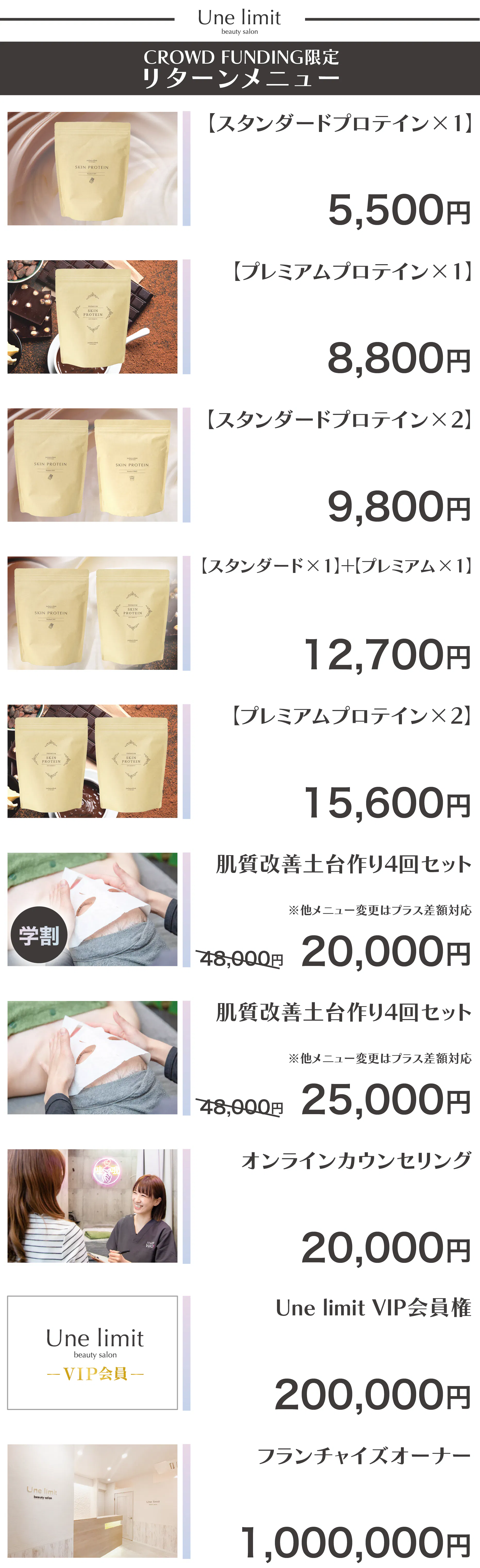 ご支援いただいた方に、Une limitの施術チケットやスキンプロテインなどの様々なリターンをご用意しました!
