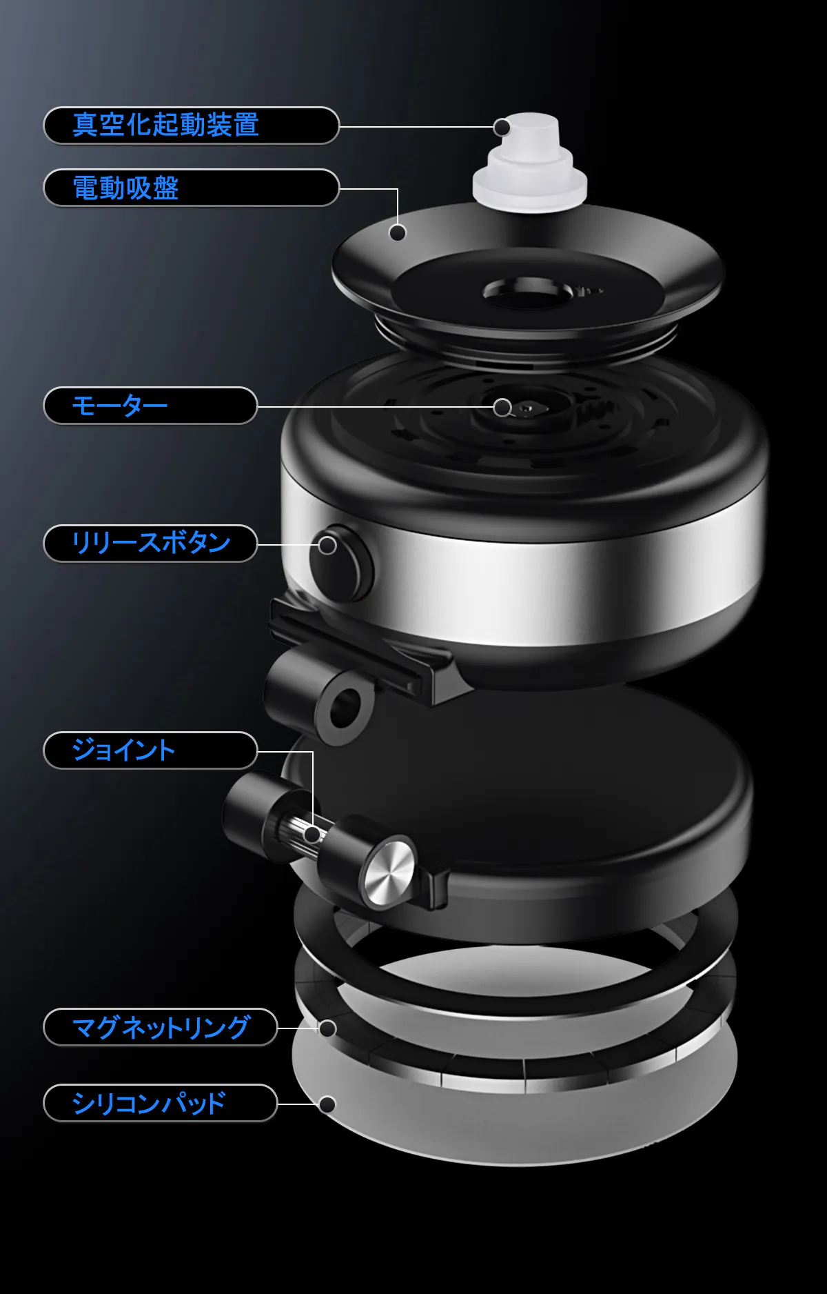 吸盤の横に配置された解除ボタンを押すだけで、吸盤内に空気が入り、真空状態が解除され、スマホを簡単に取り外すことができます。