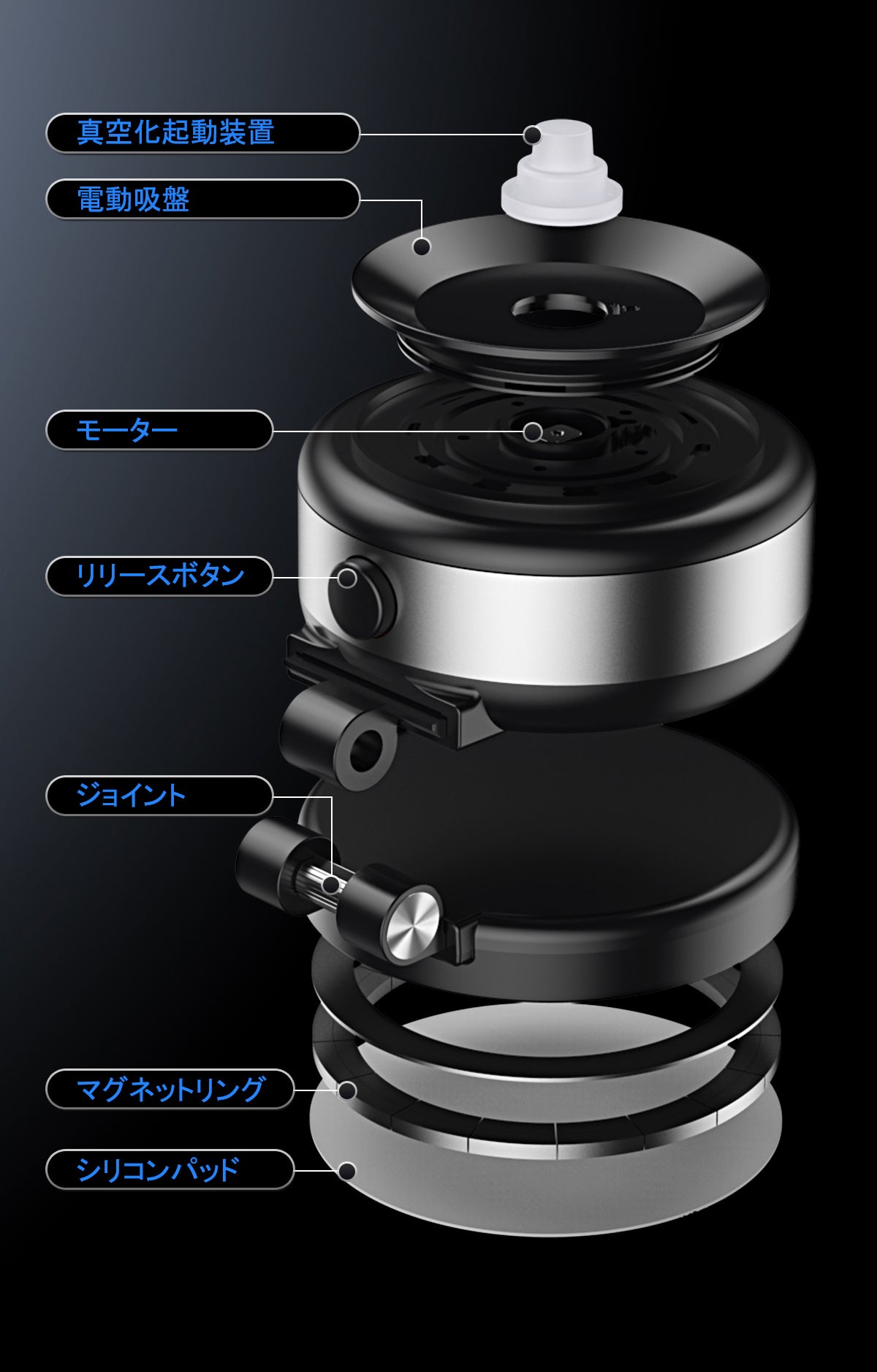 スマホがスタンドの吸盤に触れると、本体が自動的にスマホと吸盤の間の空気を真空状態まで抜き取り、スマホを確実に吸着します!