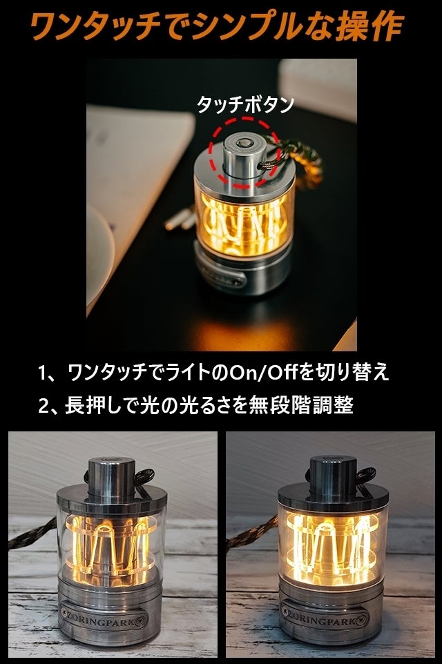 A、「ZORING PARK」は、分銅のフォルムを忠実に再現したインダストリアルスタイルを味わうことができる小型ランタンです。色は電球色で、明るさは無段階調光が可能です。使い方は簡単、コンパクトサイズで持ち運びも楽々です。アウトドアとインドア、どちらでもお使いいただけます。