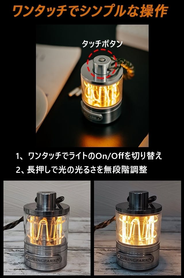 A、ランタンの上部にあるタッチボタンをタッチするとライトが点灯します。もう一回タッチすると、ライトが消灯します。長くタッチすると、明るさを調整できます。
