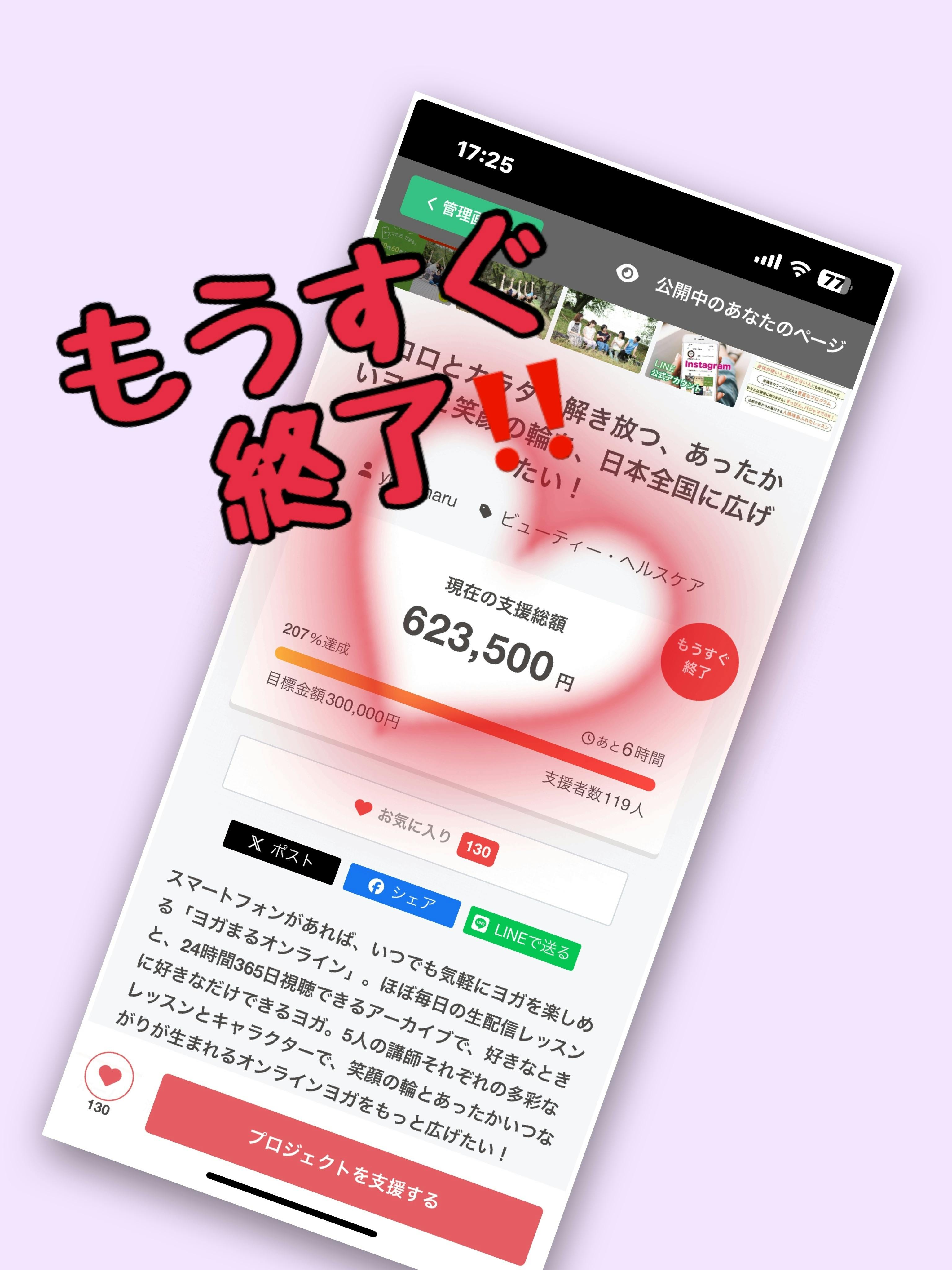 2024/08/31 18:00こんばんわ^_^ヨガまるオンライン あつこです。皆様たくさんのご支援、誠にありがとうございます!今日も笑顔の輪を広げるべく、一生懸命走っております(o^^o)クラウドファンディング終了まで6時間を切りました。8月31日23:59 で私達の挑戦は終了致します。お陰さまで目標の300.000円に対し、200%を超える達成となりました!本当にたくさんの方からのご支援、暖かいお気持ちや応援メッセージが大きな力となって、最終日を迎える事ができました!改めて、ヨガまるはみなさまに支えられ、愛され、育まれてきた場なのだと痛感しております。本当に本当にありがとうございます。最後まで諦めず、ヨガまるオンラインの笑顔の輪を広げるために、愛と希望と夢を持って最後まで走り続けます✌︎('ω')✌︎ラストのアナウンス、応援をよろしくお願いいたします!! もっと見る
