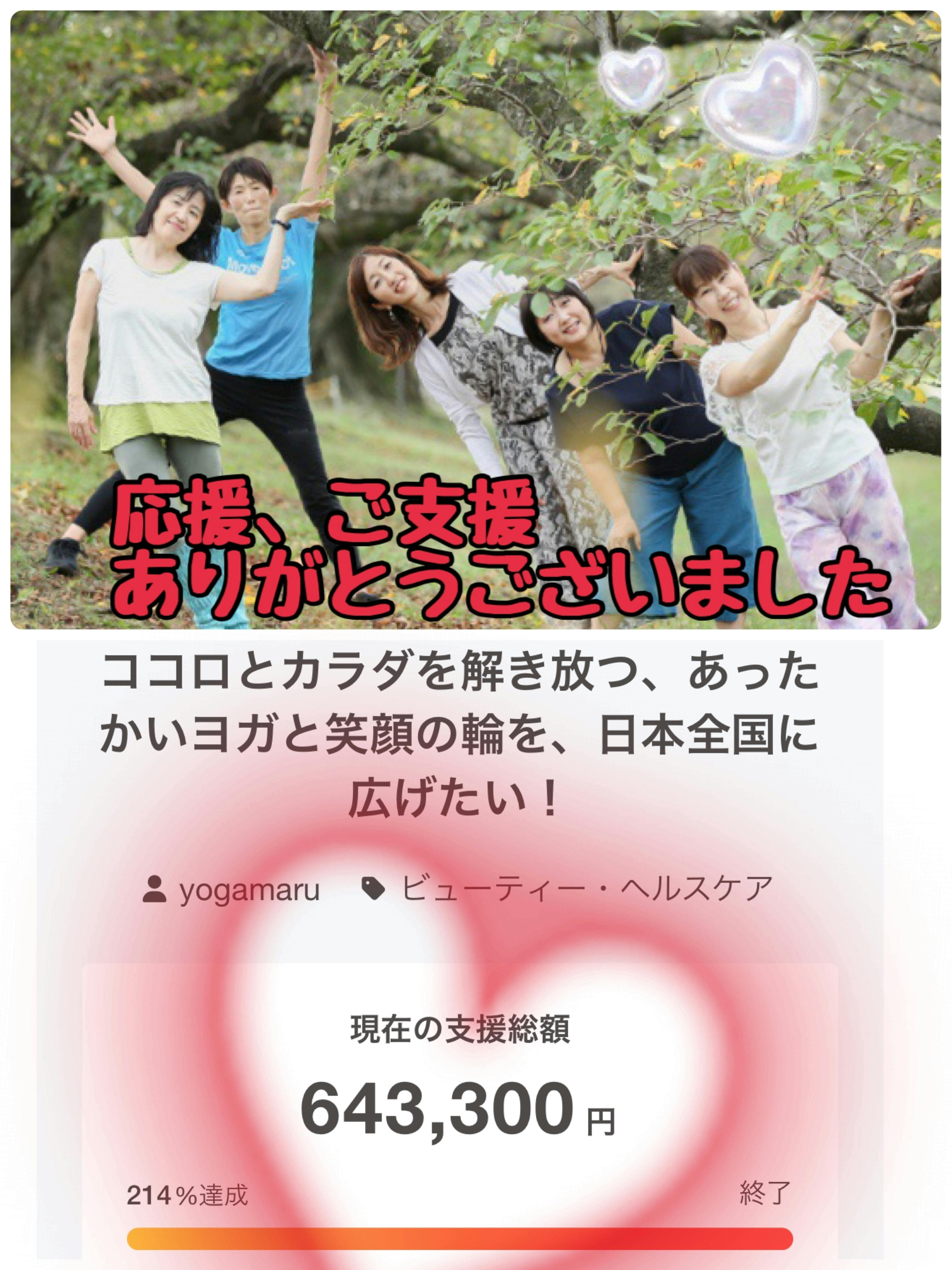 2024/09/01 14:32ヨガまるオンライン、講師のあゆです。昨夜8月31日23:59をもって、私達の挑戦は終了致しました。本当にたくさんの方からのご支援、温かいお気持ちや応援メッセージに支えられ終了出来ました事、心より感謝申し上げますm(__)m最終日には124人の方々からのご支援と643300円のご支援が集まりました。本当に本当に有難うございました。ヨガまるオンラインは『笑顔の輪を広げる』をコンセプトに、ヨガを通じ世の中の全ての方が笑顔になり、温かい世界が広がる活動を行っています。クラウドファンディングに挑戦し、ますば沢山の方にヨガを知って頂く、ヨガは体だけに良いものではなく、心をも整え心身共に健康に、そして自然に笑顔溢れる毎日を過ごし、幸せな人生を歩んでいく。まずはその一歩が踏み出せたと思っています。今回集まった支援金は、更なる笑顔の輪を広げるための活動費、及び宣伝広告費として、大切に使わせていただきます。今回のクラウドファンディング挑戦において、私たちは皆さんから温かい気持ちを頂いたり、励まされたり、支えられたり、私達講師は皆さんから沢山の恩恵を頂きました。その思いに応える為、私たちに今出来る事を精一杯取り組んでいきたいと思います。繰り返しにはなりますが、ご支援やシェアなど応援をしてくださり本当にありがとうございました。〜ヨガまる講師一同〜 もっと見る