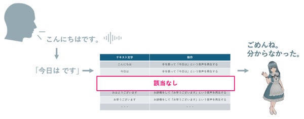 音声認識で変換された「テキスト文字」が、「対話シナリオ」を使って処理され、対話シナリオに記載された「決まった動作」が実行される