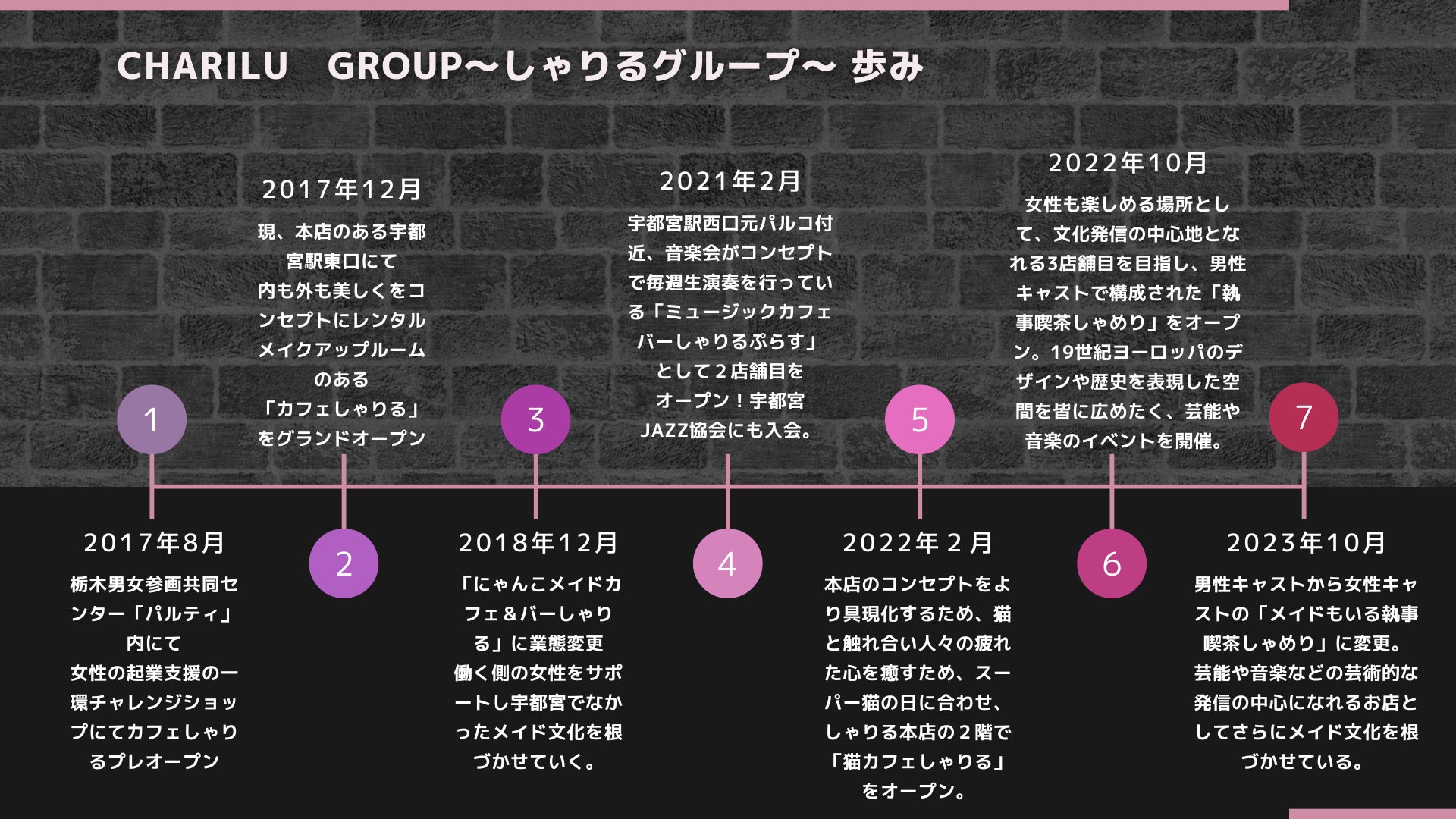 しゃりる系列で早いもので3年近く演奏させていただいております。通常のコンセプトカフェはありえなくらい音楽や文化を尊重しておりキャストさんの方々に音楽の触れ合いなどを率先して促してくださってます。女性が働きながら自分なりの生き方を探せる場所としてとても良い経営方針だと思います。コンセプトカフェを夜の職業のイメージではなく本当にコンセプトに忠実に再現し、そして従業員の方が働きながら学べる場所としてこれからもこのお店が存続してくれたらと思います。今後も応援し続けます!