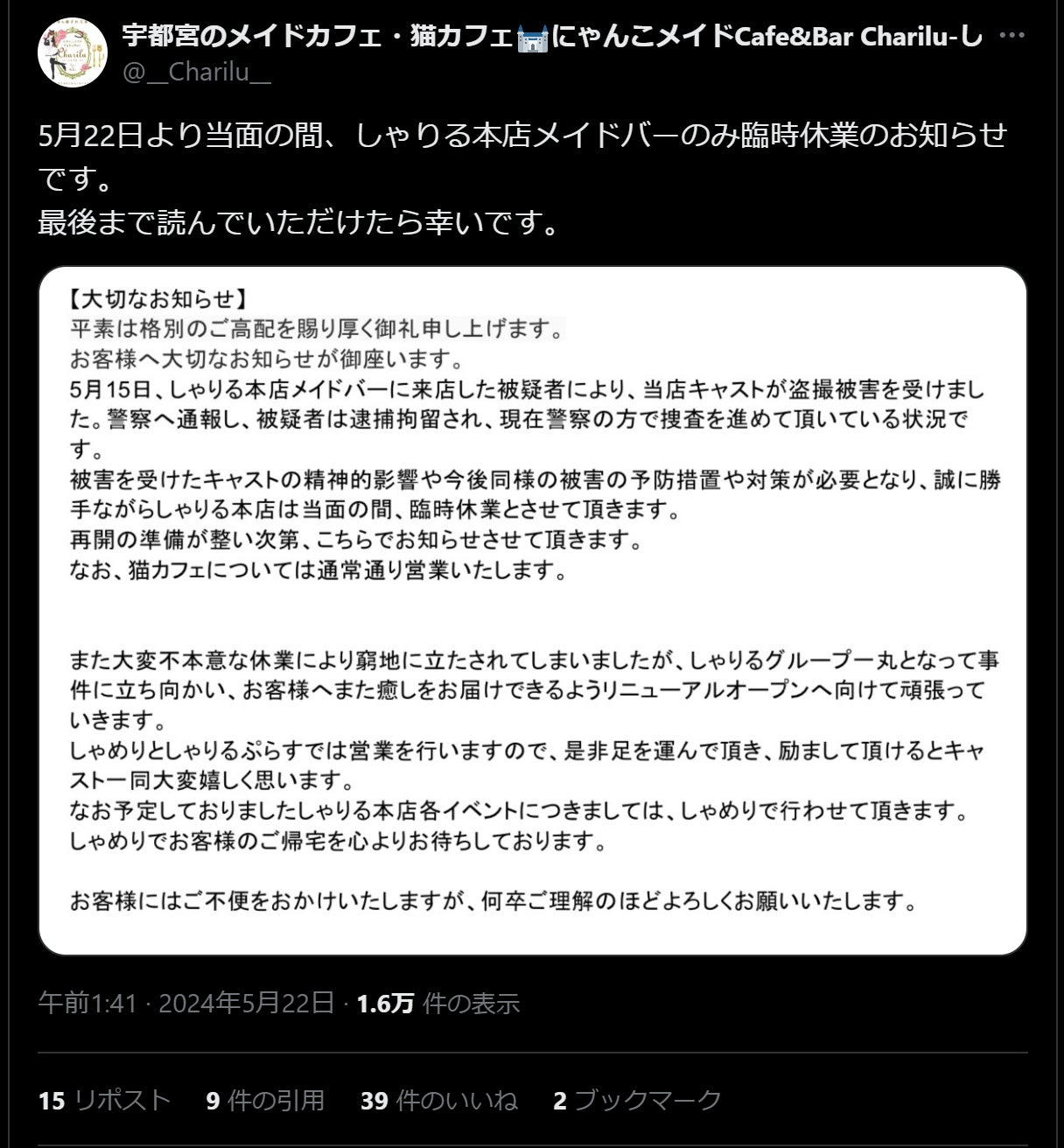 オーナー兼代表であるリリーさんの『女性が輝けるステージを創りたい』という素敵な願いから生まれたしゃりるさんが、此度このような被害に遭われてしまったこと、大変悲しく思います。どうか多くの方々から愛される素敵なお店が、無事再スタートを切れるよう、私も遠方から応援しています!!