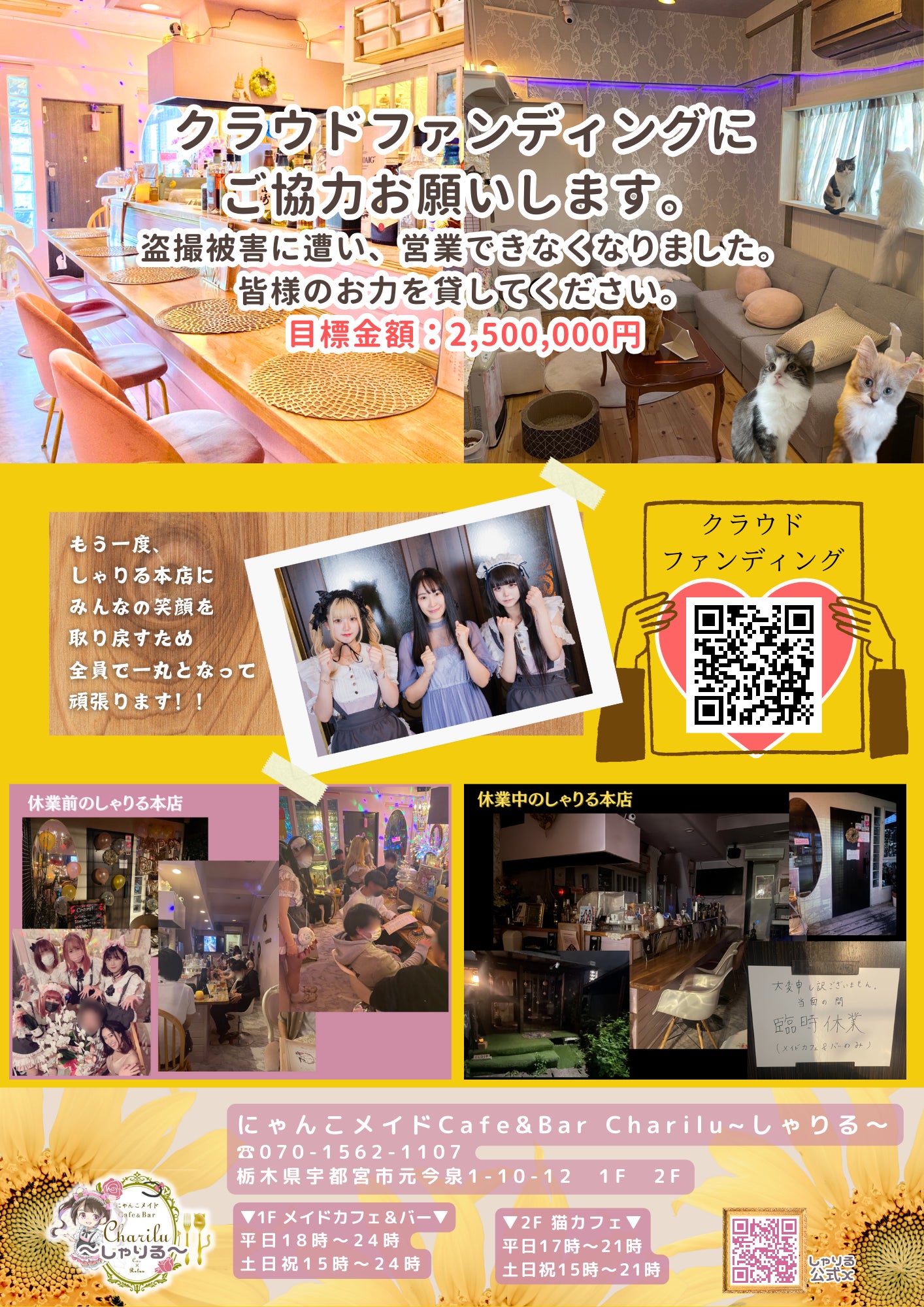 被害に会い、今はまだ怖い気持ちもありますが、また癒しの場としてしゃりるが復活し、ご主人様お嬢様にとってもメイドにとっても安全で安心できる場所になることを願っています。どうかご支援の程よろしくお願いします。