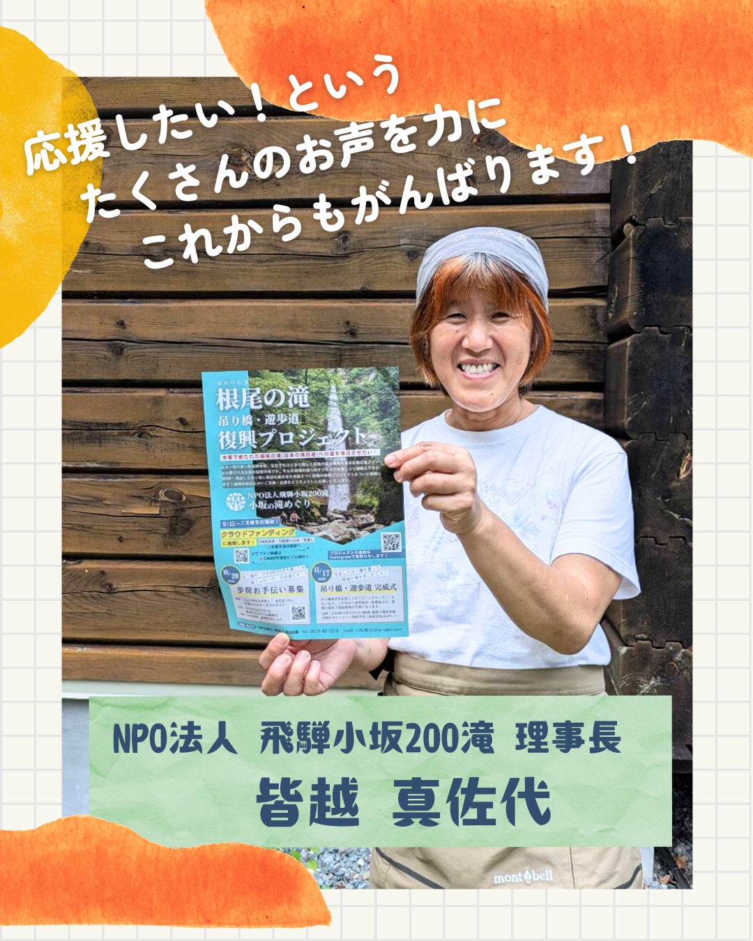 早いもので9月15日にクラウドファンディングを立ち上げてから約2か月が経過しました。がんだて公園周辺は紅葉のピークを過ぎ、冷え込む空気が冬の訪れを告げています。さて、根尾の滝の吊り橋は無事に完成し、先日開通式を行うことができました。遅ればせながら以下、活動報告をさせていただきます。▶▶10月20日歩荷イベントボランティアでお集まりいただいた方が約40名、下呂市役所の方、滝めぐりスタッフを合わせると総勢約60名でのイベント開催となりました。重い荷物を苦にもせず、16折の山道を2往復3往復と…こちらの予想をはるかに超えるみなさまのガッツあふれる歩荷のおかげで約2トンの資材を午前中ですべて運び下ろすことができました!大きな角材を背にニコニコと山を下って行かれるボランティアの皆様のお姿がとても心強かったです。▶▶10月21日〜10月22日急ピッチで吊り橋架橋ボランティアの皆さんにに運んでいただいた大量の資材を使い、10/21.22 の2日間でおおよその枠組みが組まれ、吊り橋がついに対岸に渡りました!3日間の工事の予定が23日は雨予報だったため急きょ2日間での作業に…職人の方たちが連日朝早くから真っ暗になるまで作業してなんとか雨が降る前におおがかりな作業を終えることができました。手に汗握る高度感のある場所での作業。一本一本の資材の重量を思うと持ち上げて組み上げるのは相当な体力と技術がいることと想像できます。山岳工事のプロフェッショナル 河東工業さん、マウンテンワークスさんが携わってくださったからこそできた今回の架橋工事連日の作業、本当にありがとうございました!▶▶11月4日吊り橋完成、周辺遊歩道修復吊り橋の仕上げとともに、崩壊が激しかった周辺遊歩道の修復も進められました。今回の作業にはネパールからシェルパの皆さんも助っ人として登場。重い石をものともせず石段を組み上げていく姿は神業だったそう…!たくさんの方の手により根尾の滝までの道がついに完成しました。▶▶11月17日根尾の滝遊歩道開通式&吊り橋渡り初めガイドツアー秋晴れと見事な紅葉に迎えられ、待ちに待った根尾の滝遊歩道の開通式が執り行われました。この日は遊歩道開通を記念した、ガイドツアーも同時開催。来賓の方々も合わせると総勢30名ほどにお集まりいただき賑やかな開通式となりました。16折の山道を下ると見えてくる吊り橋。その立派な姿に参加者のみなさんからも感嘆の声が上がりました。吊り橋までのアプローチも工夫がされていて、足場が狭い部分もありますが、アドベンチャー感が増してそれも楽しみのひとつになりそうです。以降、根尾の滝遊歩道は自由散策ができるコースとして一般開放されています。 ▶▶11月19日YAMAPに「小坂の滝めぐりコース」が掲載されました!登山アプリYAMAPに小坂の滝めぐり周辺の地図が追加され根尾の滝を含む4コースのコースマップができました。https://yamap.com/maps/42523小坂の滝めぐりを訪れた方の「活動日記」も日々増えていて読むのが楽しみです♪-----以上、駆け足ではありますが根尾の滝吊り橋・遊歩道復興までの活動報告とさせていただきます。令和二年の水害以降、幻となっていた根尾の滝。その素晴らしい姿をこれからより多くの方々に見ていただけることメンバー一同、うれしく誇らしい気持ちでいっぱいです。プロジェクトを進めるにあたり、みなさまのご支援・応援のお言葉が何よりの励みになりました。最後になりましたが、改めまして心より感謝申し上げます。本当にありがとうございました!これからも小坂の滝めぐりを安全に楽しんでいただけるよう、NPOでは日々の案内所業務やメンテナンスを続けてまいります。がんだて公園及び小坂の滝めぐりでは四季を通して素晴らしい景色が待っています。根尾の滝まではちょっと遠い…という方も、駐車場から徒歩10分で見ごたえのある滝(三つ滝)がお迎えしますのでご安心ください♪どうぞ来年も引き続き、小坂の滝めぐりをどうぞよろしくお願いいたします。※がんだて公園及び三つ滝・からたに滝コースは冬季閉鎖(12/15〜3/末)となります。→ 2月は「小坂な冬の滝めぐり(氷瀑ガイドツアー)」を開催しています! 詳細・ご予約はHPからどうぞ https://216works.jp/215/-----☆☆今後も小坂の滝めぐりの活動を応援!してくださる方へ☆☆飛騨小坂200滝では一緒に活動をしたり、活動を応援してくださる方を募集しています。会員になっていただくと、各ツアーに会員価格で参加していただくことができる他、会員限定のモニタリングツアーや小坂の自然を守る環境整備作業等へも参加いただけます。【NPO法人飛騨小坂200滝 会員募集】私たちの活動についてhttps://www.osaka-taki.com/about/会員についてご興味のある方は事務局までお気軽にお問合せ下さい。HPやInstagramにて情報発信中!フォローやシェアをよろしくお願いいたします!★小坂の滝めぐりHP http://osaka-taki.com/IG https://instagram.com/200falls/★根尾の滝 吊り橋・遊歩道復興プロジェクトIG https:/