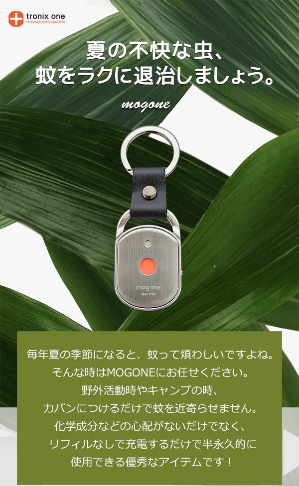 毎年夏の季節になると、蚊って煩わしいですよね。そんな時はMOGONEにお任せください。野外活動時やキャンプの時、カバンにつけるだけで蚊を近寄らせません。化学成分などの心配がないだけでなく、リフィルなしで充電するだけで半永久的に使用できる優秀なアイテムです!