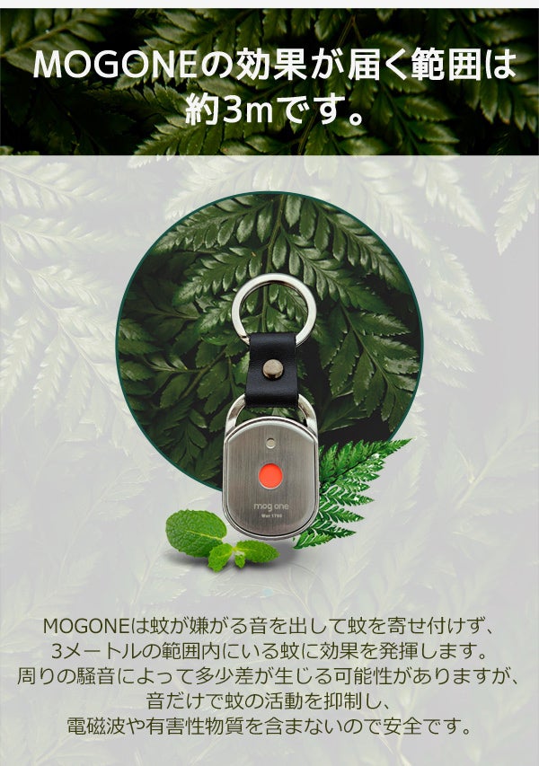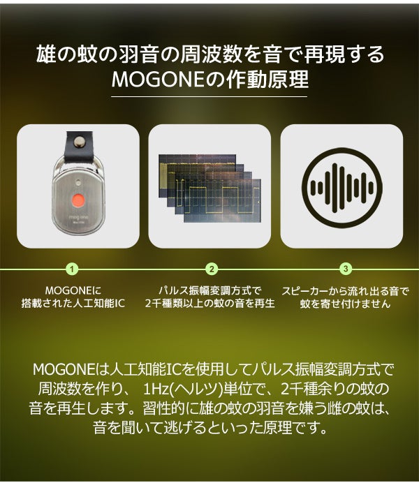 また、蚊の天敵であるトンボの羽音と蚊が嫌がる周波数の音を順次クロスオーバーする方法で、蚊を寄せ付けないMOGONEならでの技術特許を取得した製品です。
